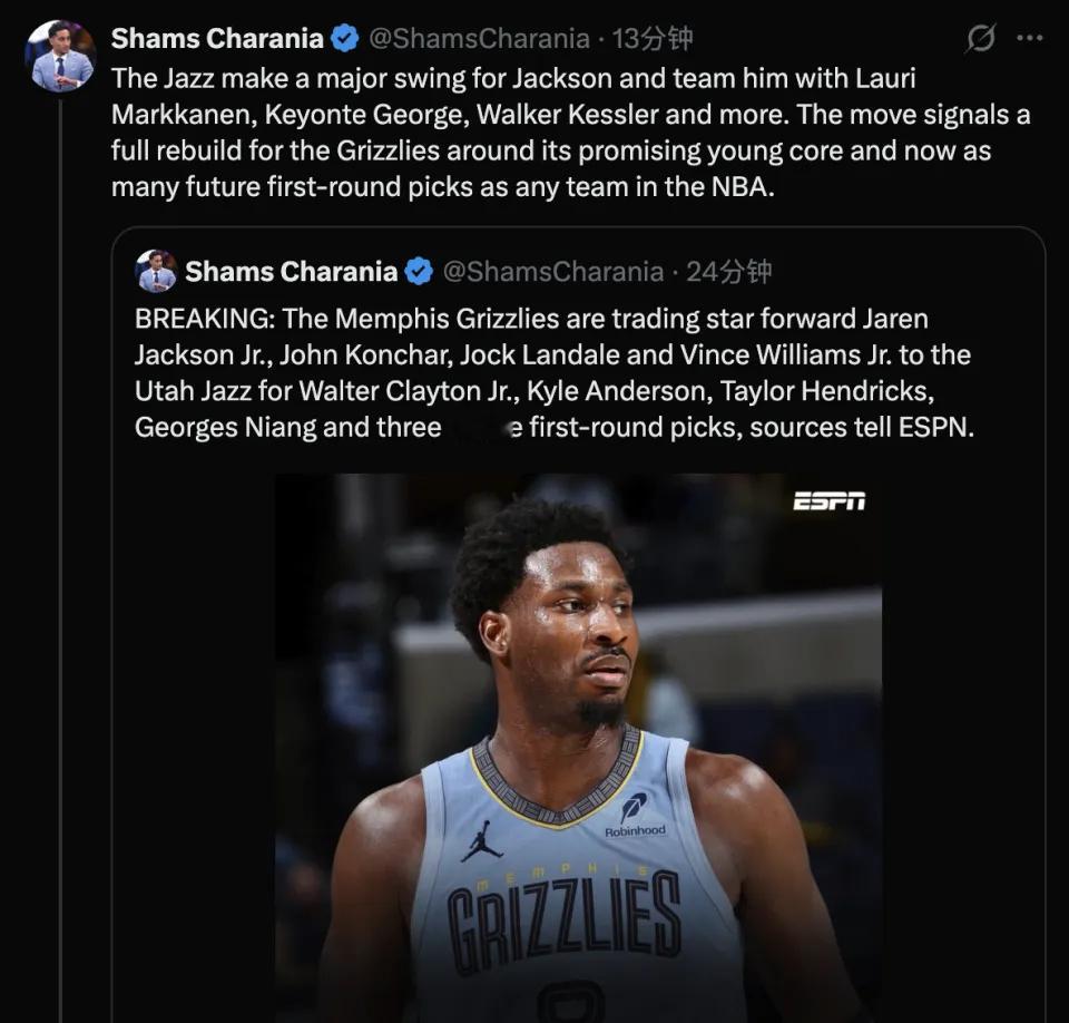 名记Shams报道,灰熊与爵士达成以小贾伦-杰克逊为主体的4换7交易,小贾伦-杰