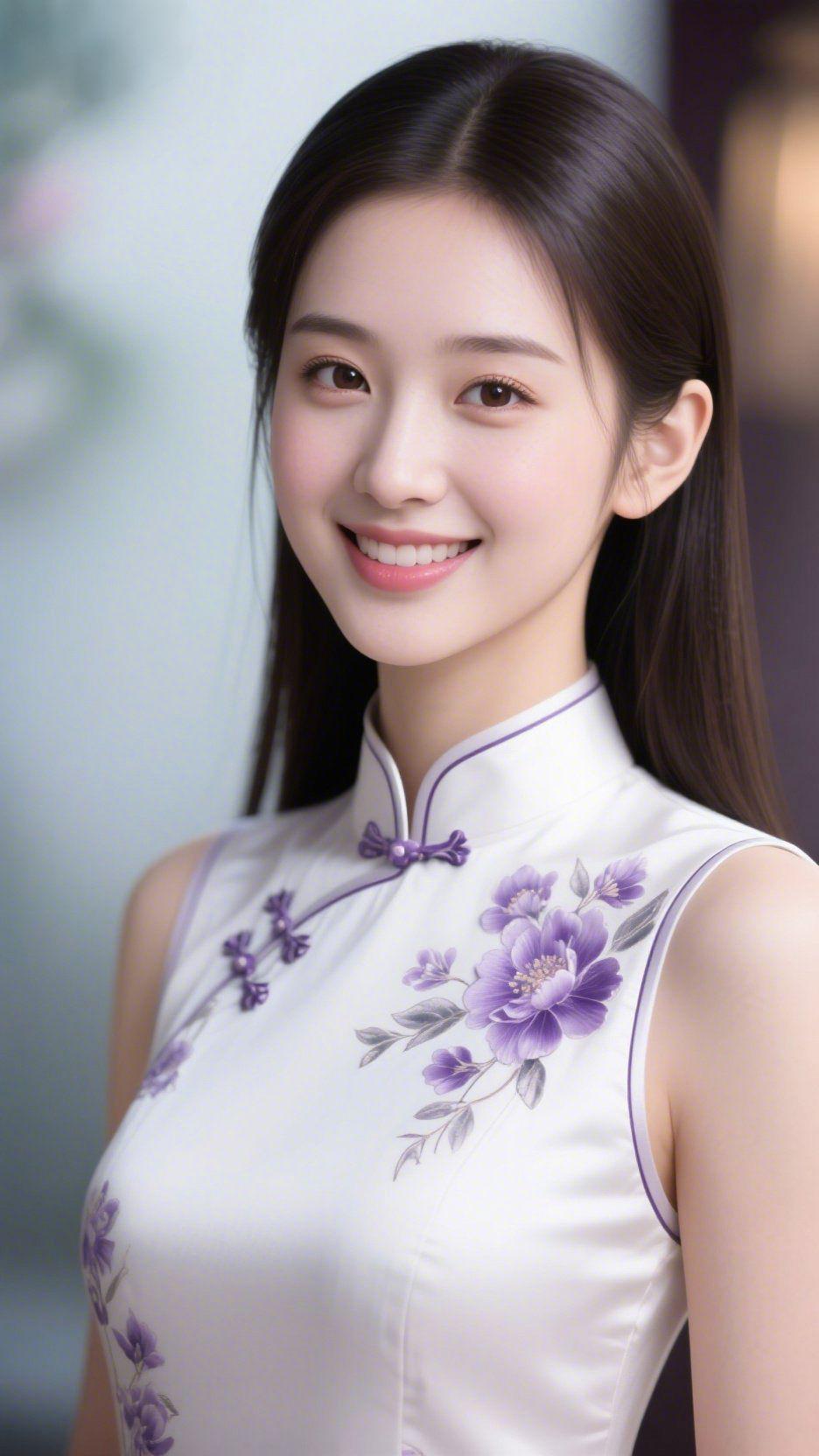 素襟紫香,雅生柔意 月白缎面绣着紫花,似将春夜藤萝轻缀于旗袍襟间。 立领裹着淡紫边纹,盘扣如落瓣轻依,长发垂肩时,发梢擦过衣料的软——并非繁冗妆点,是宣纸上淡染的紫,温然含着笑意。 衣身舒展处,花色是轻开的柔,从肩侧漫向襟角,如院墙探过的藤枝,带着夜露的润。她立在那里,连背景朦胧都随之轻缓,成了时光里妥帖的雅意。 原来国风之美,从非古板韵致,是这一身素襟裹着含笑的眼,让人心头漫开春的软风。 旗袍素紫雅 国风柔意