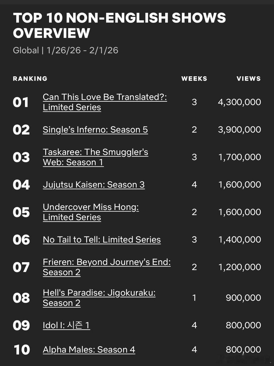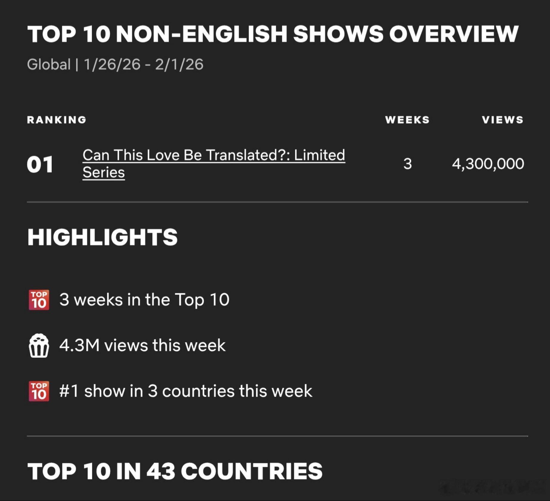 金宣虎x高允贞这爱情可以翻译吗 连续两周荣登网飞非英语剧集收视率榜首🎉(期间:2026年1月26日至2026年2月1日)第三周观看次数达430万次累计观看时长:2.278亿小时累计观看次数:1730万