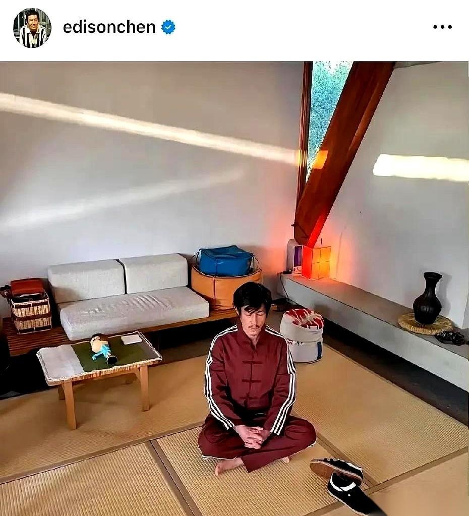 陈冠希一张打坐的照片,直接把人看懵了。 以前说他越来越像本山大叔,大家还只是当个梗。可这张照片里,一身酒红色中式盘扣衫,头发剃得干干净净,双腿一盘,手往膝盖上一搭,整个人的气场都变了。 镜头拉近,那张脸才是重点。 不是胖了,是瘦,瘦到两颊的肉直接凹了进去,颧骨高高地支棱着,下巴的线条跟刀刻的一样。配上那撮标志性的八字胡,眼神直勾勾地盯着一个地方,整张脸一个字,硬。 这身形,这发型,这坐姿,活脱脱就是李小龙的影子。 要不是照片上明明白白打着他的名字,你拿给谁看,谁都得迟疑三秒。这还是当年那个歪嘴笑的少年吗? 有人说这是岁月不饶人,有人说这叫修炼出了精气神。你觉得呢?