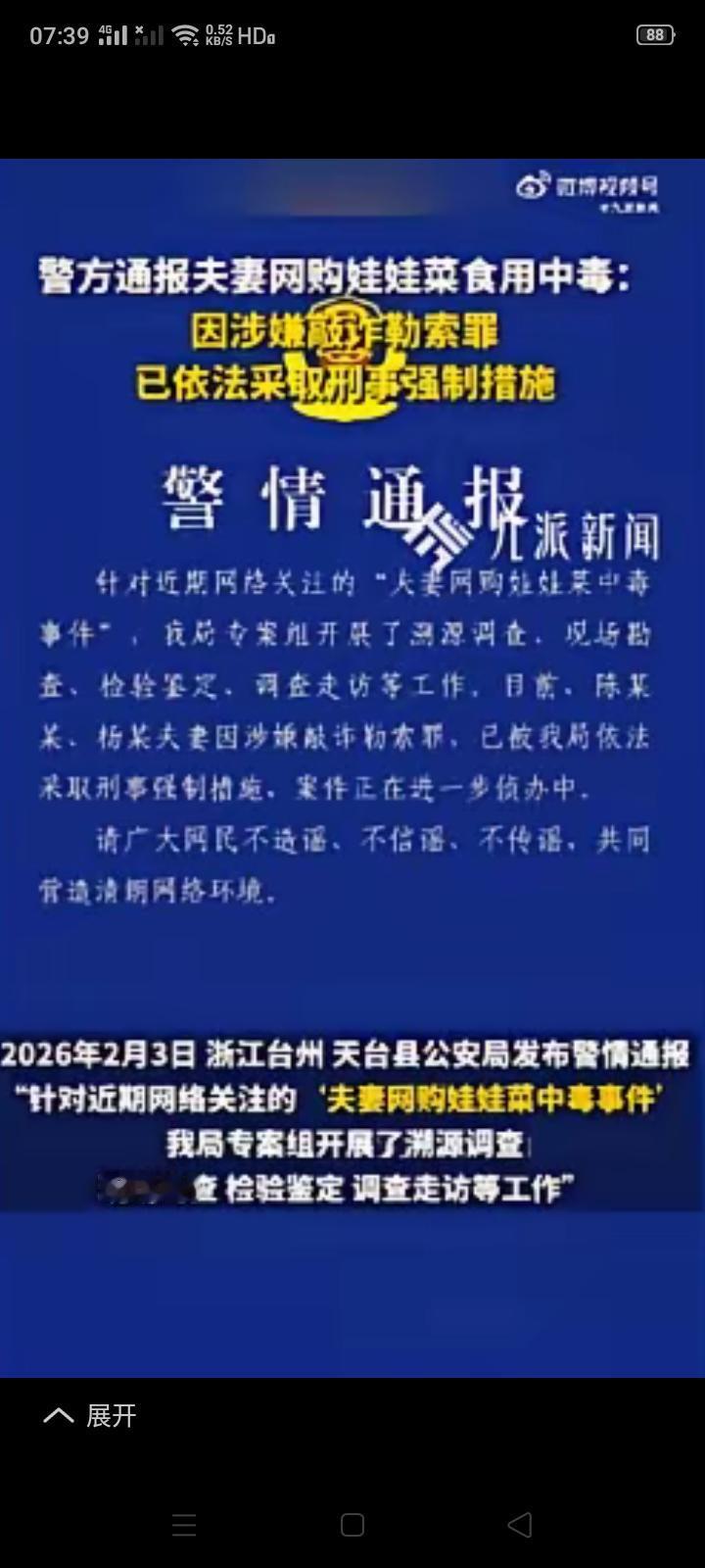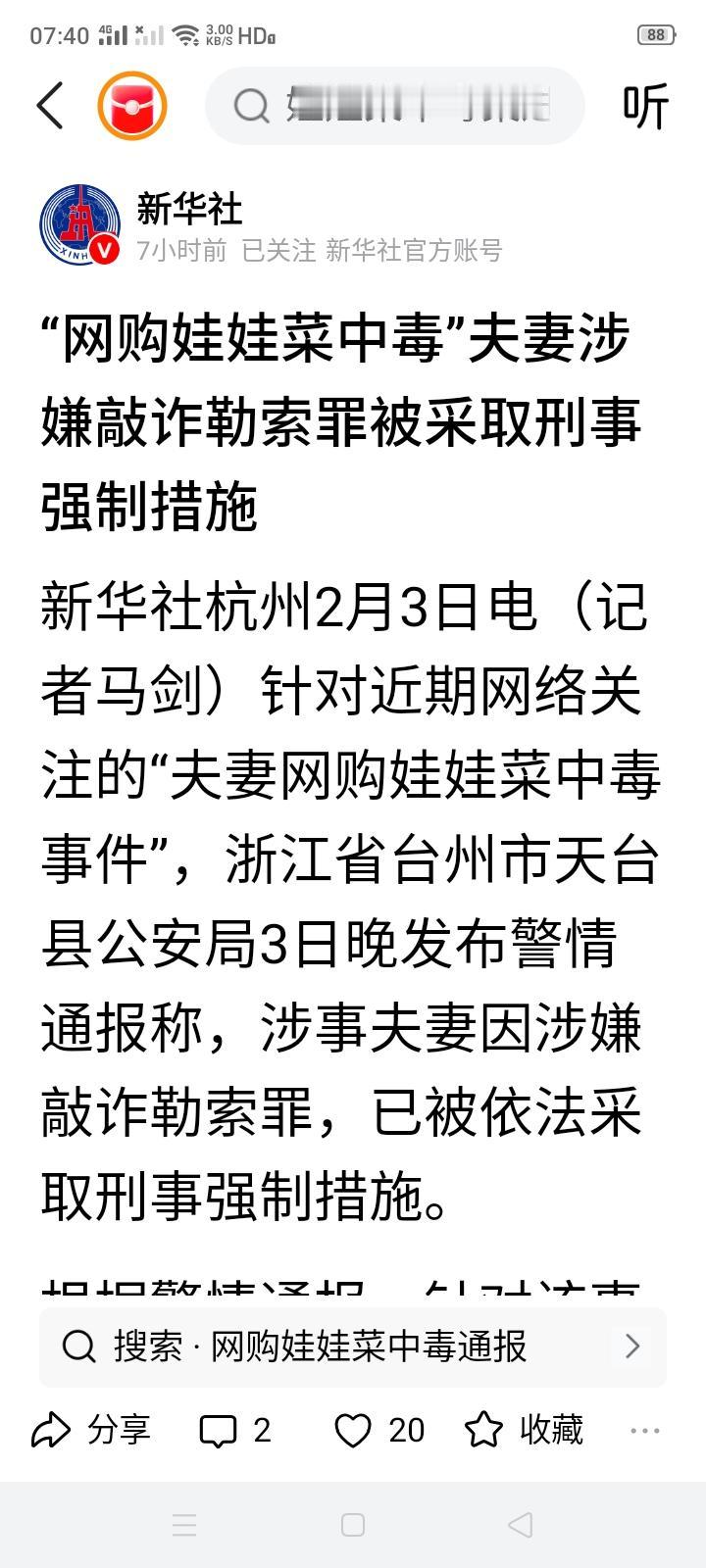 前两天才有看官媒报道“有夫妻俩吃网购娃娃菜中毒”的事,吓得我都不敢网上买菜了。 不料现在事件又出现了反转,官媒又报道说是老鼠药是夫妻俩自己放的,目的是为了敲诈勒索平台和商家。那么这对夫妻在医院Icu病房住那么多天,医院的诊疗记录是不是造假了?自己下毒会把自己毒那么严重?还是本就是夫妻俩各自想毒害对方,结果都中毒了?这事太蹊跷了,官媒的报道也跟不上事件的反转速度了!