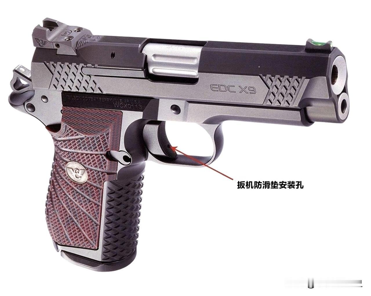 美国威尔逊战斗公司EDC X9手枪 美国威尔逊战斗公司新出的EDC X9手枪,属于M1911系列的全尺寸实战款。 枪口有个别致的内凹造型,套筒两侧前后都刻了大块菱形防滑纹,样子好看还能防止手滑。 套筒右边的抽壳钩还能起到膛内有弹提示的作用,只要膛里有子弹,抽壳钩前端就会凸出于套筒侧面,白天能看清,晚上用手摸也能察觉到。 套筒顶部后面装的是U形缺口照门,准星是绿色光纤管的,瞄准很方便。握把护板有黑色和暗红黑纹两种款式,还能根据自己手的大小选对应的尺寸。 护板上的防滑纹设计挺有特点,左右上方是细密的横条,下方是网格状,上面还有从后往前的放射状凹槽,后侧是宽大的网格纹,和前面的防滑纹相互呼应。 扳机前面有竖条防滑纹,下方还有螺纹孔,能选装不同尺寸的防滑垫,让射击的时候更舒服。 这枪总长188毫米,枪管长102毫米,用的是9毫米巴拉贝鲁姆子弹,弹匣能装15发。