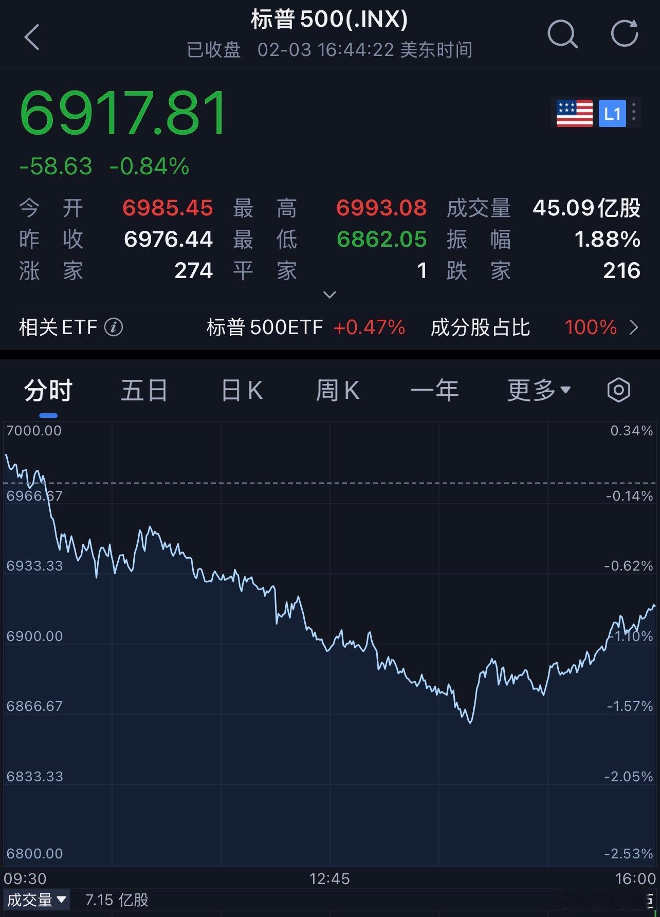 昨夜美股平开跳水,截至收盘,标普500指数跌0.84%,报6917.81点;纳斯达克综合指数跌1.43%,报23255.19点;道琼斯工业平均指数跌0.34%,报49240.99点。