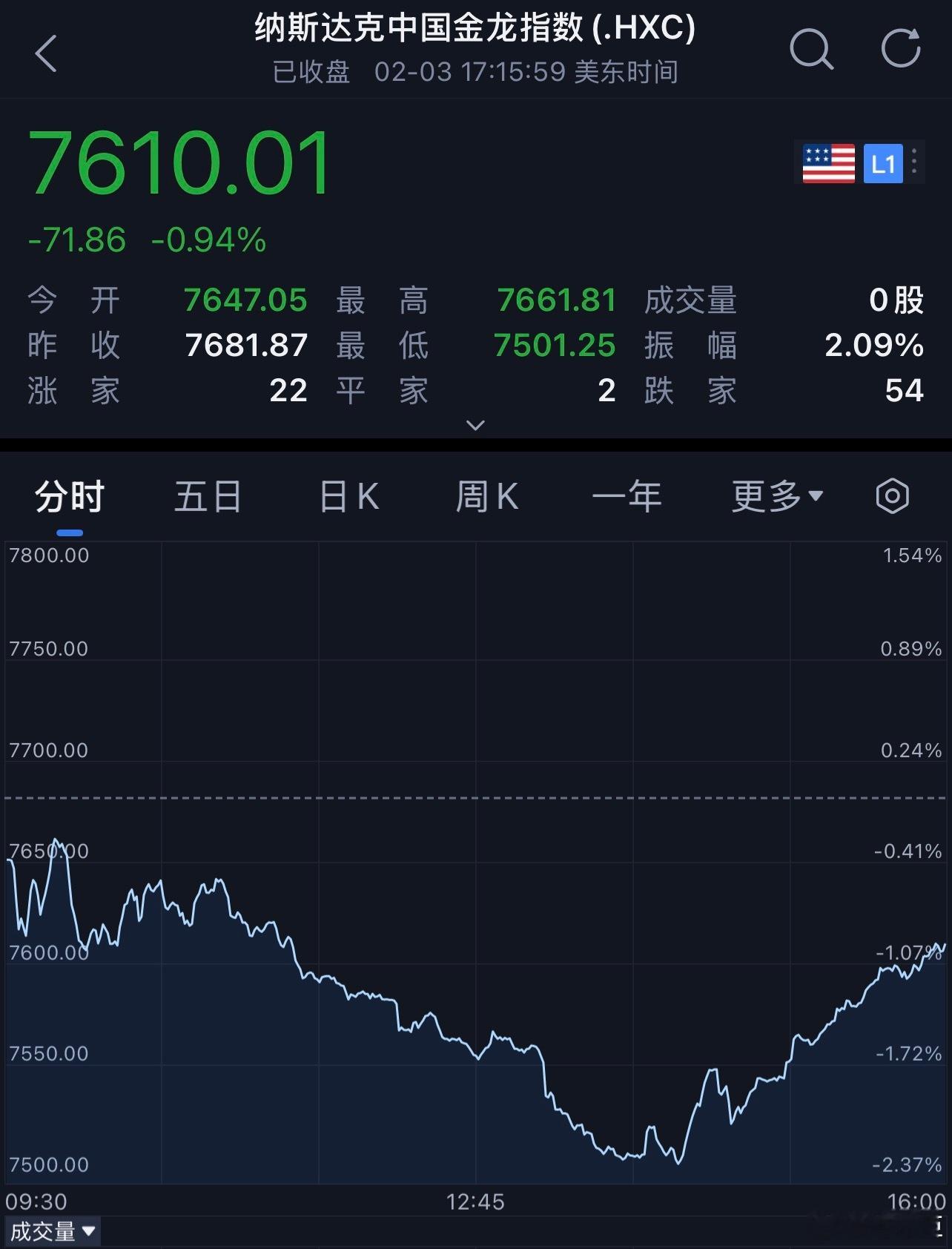 中概股多数走弱,纳斯达克中国金龙指数收跌0.94%。