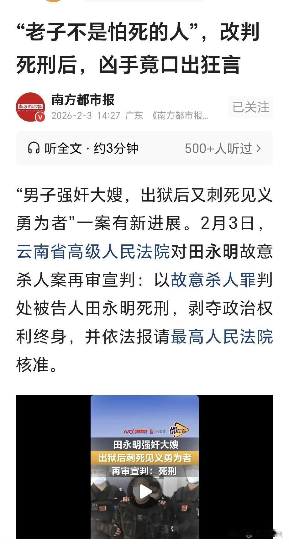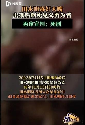 丧心病狂!云南玉溪,一男子强jian了嫂子,事情败露,他拿刀报复,事后,男子被判刑,他假装老实,熬到了出狱,他越想越气,决定再次报复,他拿了把刀子,冲到嫂子家里,嫂子见状撒丫子就跑,一村民上前阻挡,被男子几刀捅死,男子追上嫂子连捅嫂子数刀,男子看嫂子倒下,他以为报复得逞,他隐姓埋名,逃到了外地,谁知嫂子命大,只被捅成了轻伤,20年后,男子被抓,经过一审二审,结果令人拍手称快! 1996年9月,田永明强奸了自己的嫂子,嫂子赵某某羞愧难当,哭的昏天黑地,很快就被丈夫知道。 丈夫田某是田永明的亲哥,亲兄弟竟然欺负自己的老婆,田某对他一顿呵斥,再敢欺负嫂子有你小子好看的! 田永明被哥哥骂了,他不思悔改,反而在心里埋怨嫂子,你敢告状,我和你没完,他拿着把刀就要报复嫂子。 赵某某被吓得心惊肉跳,如果不报警日子就没法安生,之后赵某某被警方抓获,被判了有期徒刑,让他专心进行改造。 2002年7月15日,田永明刑满释放,他恨得咬牙切齿,都怪嫂子害了自己! 他回到家里,并不觉得自己做错了什么,他觉得自己想要的东西,你就得心甘情愿的给予。 一旦你敢反抗,我和你就没完,你竟然敢让我去坐牢,那你就要等我出来给你看看! 他思前想后,绝对咽不下这口气去,这几年的改造对他来说,压根就没有起到任何的作用。 可是他还想休息,琢磨一下咋样报复,于是他假装老实,在家里休息到11月份。 11月13日,到了晚上8点的时候,田永明感觉时机到了,他拿了把刀子,悄无生息的闯进了嫂子赵某某家门。 赵某某听到大门一响,她急忙伸头一看,竟然又是田永明来了! 只见他目露凶光,举着刀子,明晃晃的,就一步一步走了进来。 赵某某心惊胆战,趁他不备,赶忙从家里跑了出来。 她边跑边喊,大声呼叫着救命啊,田永明要杀人了~ 这时天已经黑了,路上根本不见有人,赵某某腿都是软的,她已经领教过田天明的手段。 赵某某一路狂奔,田永明举刀撵着,谁知这时,37岁的村民刘铭富走过,他一看田永明举刀伤人,立刻就上前将他挡住。 谁知田永明丧心病狂,举刀就朝刘铭富捅去,刘铭富被捅了数刀,他轰然倒下,不幸死亡。 赵某某看到田永明杀了刘铭富,知道他已经发狂,她腿打哆嗦,每迈一步,异常的沉重,她跑不动了,很快就被田永明追上。 田永明追上赵某某后,对着她就连捅了数刀,赵某某应声倒下,田永明迅速逃走。 田永明以为,他已经把赵某某捅死,他连伤两人,这回事情大了,如果被抓,他这一辈子就算完了。 于是他隐姓埋名,匆匆逃到了外地,他以为只要离开了家乡,肯定就不会再被人找到。 可天网恢恢,自己做的,总有一天是要还的,正义也许会迟到,但是一定是会来到! 2022年2月24日,田永明被抓获,他好日子到头,终于被送上了法院。 2022年11月,一审以故意杀人罪判处田永明死刑,缓期二年。 田永明不服,提出了上诉。 2025年10月26日,高级法院驳回上诉,维持原判,28日决定,对此案再行审理。 再审认为,田永明不顾伦理,刑满释放后仍不思悔改,再次行凶杀人。 田永明在追杀嫂子赵某某时,遇到村民阻止,他不管不顾,直接讲村民捅死。 之后,他追上赵某某连捅几刀,最终致一人死亡、一人轻伤。 田永明犯罪情节特别恶劣,危害极大,且系累犯,就应该从重处罚。 原判定罪准确,但适用法律错误,量刑明显不当。 《刑法》第65条累犯从重处罚规则,简单来说,就是只要之前被判过有期徒刑以上刑罚,刑满释放后5年内再犯要判有期徒刑以上的新罪,就必须从重处罚,且不能适用缓刑、不得假释。 田永明1996年因为强奸和持刀报复被判有期徒刑,2002年刚出狱4个月就持刀杀人,完全符合累犯的认定标准。 他第一次犯罪就突破伦理底线,出狱后不仅不悔改,反而变本加厉,为了报复杀害无辜村民,已经到了无可救药的地步。 一审和二审最初判死缓,其实是遵循了“上诉不加刑”的原则。 但是这种人根本没有改造的可能,放出来只会继续危害别人。 因此再审宣判:以故意杀人罪判田永明死刑! 尘埃落定,田永明依旧态度嚣张,他还大声叫嚣: 老子不是怕死的人,老子如果怕死就不会活到今天! 田铭富的儿子十分欣慰,父亲终于可以安息了。 对此,你怎么看?