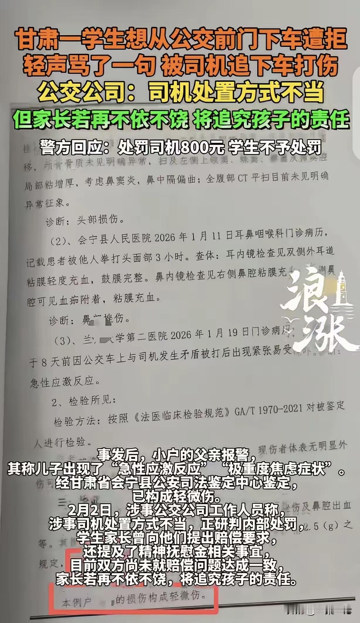 甘肃,一16岁男孩坐公交车,他想从前门下车,司机不让,男孩轻声骂了一句,被司机追下车打了一顿,男孩父亲愤怒报警,说儿子出现“急性应激反应”患上重度焦虑症,构成轻微伤,要求司机赔钱,并支付精神抚慰金。不料,公交公司回应:司机不对,但家长如果再不依不饶,将追究孩子的责任。 甘肃街头,这桩小事,照见的是人心的躁戾,与规则的偏斜。 那日天少年晓峰乘公交,车将到站,他急着赶路,便往近前的前门走去。 司机老李从后视镜瞥见,厉声喝止:后门下,前门禁行。 呵斥来得突兀,少年心下一惊,脱口低声骂了一句,不过是少年人赌气的碎语。 偏生这碎语,落进了司机的耳朵。日日握方向盘,载着满车人奔波,本就攒着几分疲惫火气。 他只觉这孩子不守规矩,还敢出言不逊,全然忘了自己是服务的从业者,是成年的长者。 车刚停稳,老李解了安全带,大步冲下车,揪住少年衣领便挥拳相向。 少年懵在原地,又怕又慌,挣扎不得,只能任拳头落在身上,眼泪砸在衣襟上。 路人围拢指责,老李才悻悻松手,放了吓破胆的孩子回家。 归家后的晓峰,整个人塌了下去。夜里惊梦连连,白日惶惶不安,连门都不愿出。 父亲老陈带他就医,诊断书明明白白:急性应激反应,重度焦虑,身体构成轻微伤。 为人父者,看孩子遭此横祸,怒不可遏,当即报警,要求司机赔付医药与精神抚慰金。 赔偿协商陷入僵局,公交公司的回应,更叫人寒心。 公司承认司机有错,却撂下话:家长若再不依不饶,便要追究少年骂人的责任。 这话一出,网上吵翻了天。 有人赞公司护着员工,有血性,说少年不守规矩又骂人,本就该受教训。 有人骂司机仗势欺人,骂公司本末倒置,拿未成年孩子的错,遮掩打人的大过。 我向来以为,世间的是非,从不是非黑即白,却有轻重之分。 少年不守乘车规则,低声咒骂,确是失礼,是家教与性子的缺憾。 可他不过十六岁,是心智未熟的未成年人,一句气话,远够不上被拳脚相向的罪责。 司机身为成年人,手握公共交通的职责,本该克制处事,化解矛盾。 他却被怒火冲昏头脑,追车打人,将口舌之争,变成了人身伤害。 这一拳,打碎的是职业操守,是对未成年人的保护,更是社会本该有的温良。 公交公司的表态,更是失了格局。不先反思员工管理的疏漏,反倒拿少年的小过做挡箭牌。 仿佛只要孩子有半分错,成年人的暴力便有了借口,这逻辑,站不住脚。 翻看法条,《民法典》写得清楚:侵害他人造成人身损害,需赔付医疗、康复、精神损失等各项合理费用。 司机的拳头,造成了轻微伤与重度焦虑,赔偿本就是法定义务,无可推诿。 警方的处置,也算公允。念及少年未成年,情节轻微,不予处罚。 动手的司机,最终被罚八百元,为自己的冲动,买了单。 我总觉得,这世上的规则,是用来守秩序的,不是用来逞凶的。 这世上的强弱,是用来护弱小的,不是用来欺稚子的。 少年的错,可教,可劝,可训诫,唯独不该用拳头解决。 司机的怒,可疏,可忍,可依规处置,唯独不该越界伤人。 公交公司的担当,该是严管员工,安抚伤者,而非倒打一耙。 一件小小的公交纠纷,闹成身心俱损的官司,实在不值。 愿这世间的人,都能收一收心头的躁火,守一守行事的底线。 别让一时的意气,毁了少年的前程,也别让失度的暴力,寒了寻常人的心。 对此事,你站哪一方?评论区说说公道话。