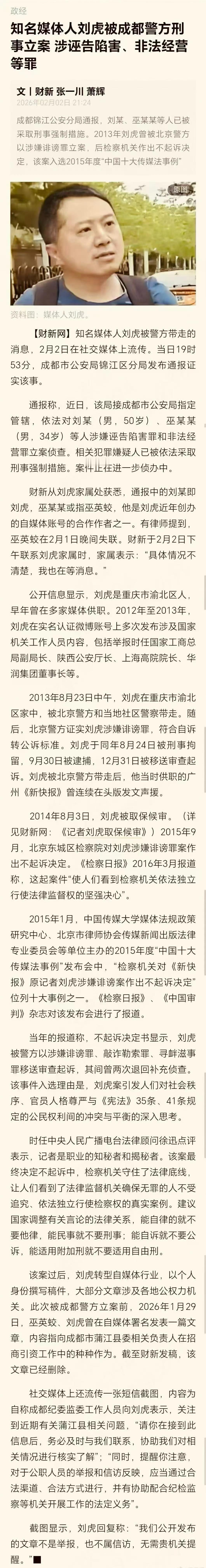 财新传媒对知名媒体人刘虎被刑事立案一事的报道。