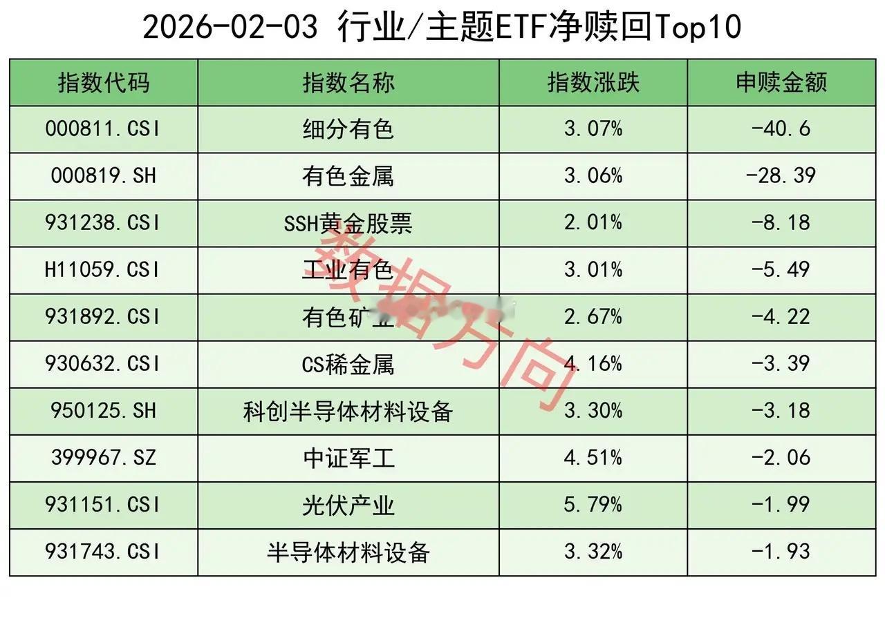 细分有色指数(-40.6亿)、有色金属指数(-28.39亿)、SSH黄金股票指数(-8.18亿)、工业有色指数(-5.49亿)、有色矿业指数(-4.22亿)、CS稀金属指数(-3.39亿),一起进入赎回榜,且金额比较大。