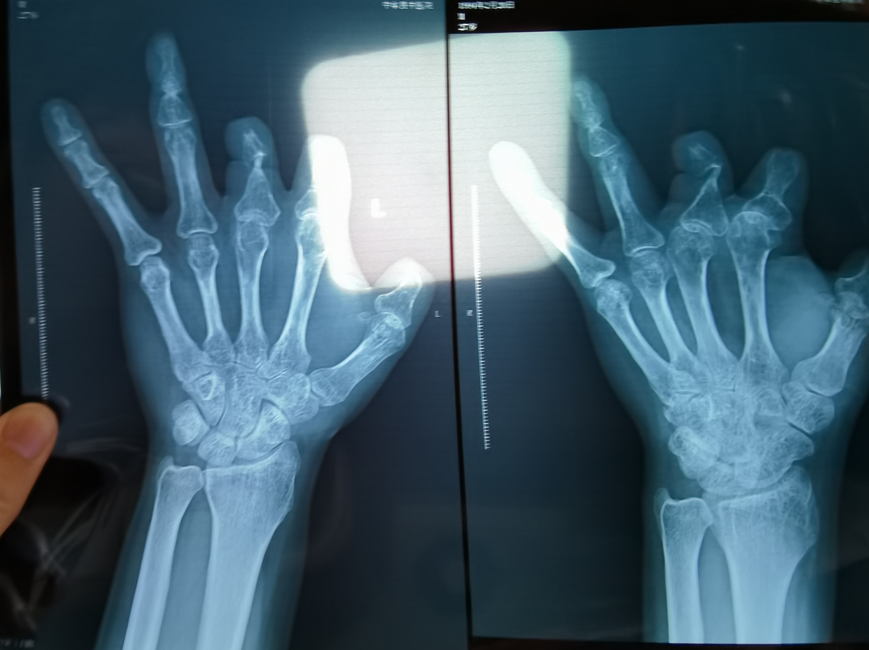 2021年12月,患者彭先生拍摄的左手X光片,未见收费单据中列出的微血管吻合装置。新京报记者程亚龙摄