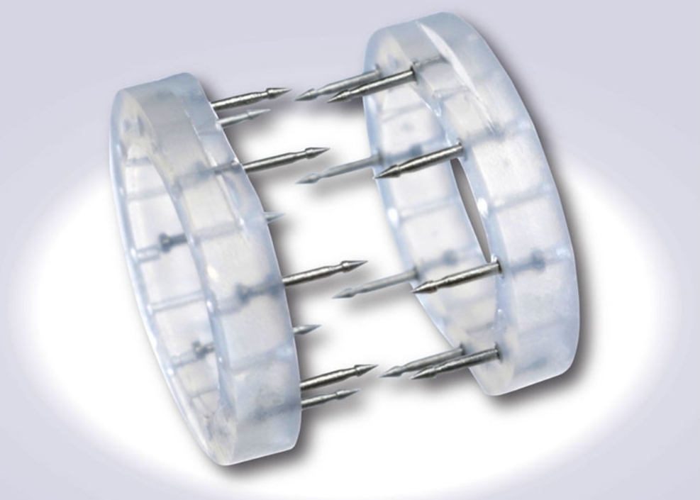 公开资料显示,该微血管吻合装置是一款由国内医疗公司代理的进口医疗器械。产品由两个超高分子量聚乙烯圆形环组成,上面带有不锈钢针。吻合血管时,将断开的血管勾在带有不锈钢针的圆环上,使用钳夹将圆环闭合,可缩短手术时间,利于术后恢复。