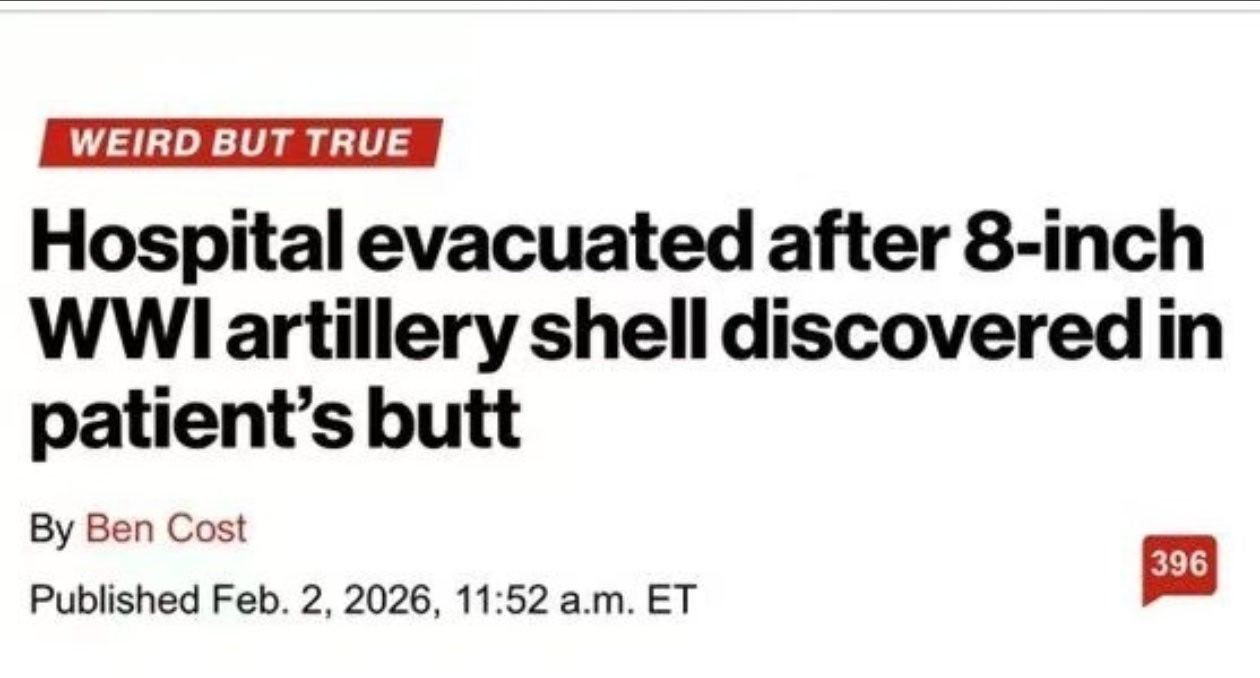 魔幻的行为:法国一名24岁男子将一枚二战时期未爆的炮弹插进自己的肛门,取不出来深夜被送到急诊室,导致图卢兹朗格伊医院全体人员被疏散。