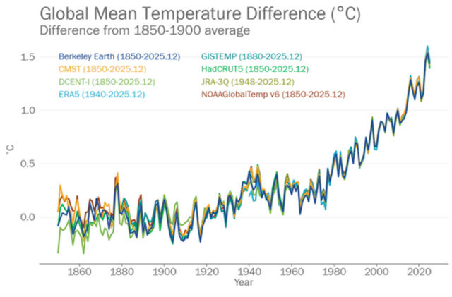 八个数据集显示的1850年至2025年相对于1850年至1900年平均水平的年度全球平均气温异常情况,如图例所示。