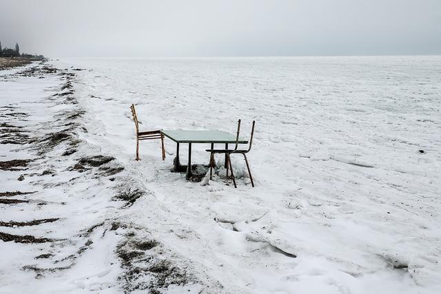 当地时间2026年1月26日,俄罗斯格尼切斯克,亚速海冰封,桌子和破损的椅子散落在海边。