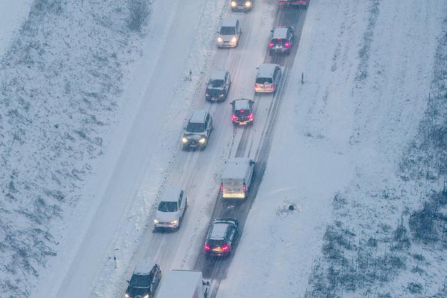 当地时间2026年1月26日,德国北莱茵-威斯特法伦州弗洛托,一辆辆汽车被堵在被积雪覆盖的主干道斜坡上(无人机航拍)。