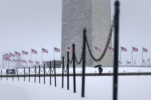 当地时间2026年1月25日,美国华盛顿,暴风雪下打伞穿过国家广场的行人。