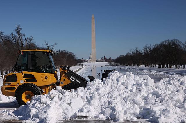 当地时间2026年2月2日,美国华盛顿,林肯纪念堂前,一辆扫雪车正在清理结冰的积雪。