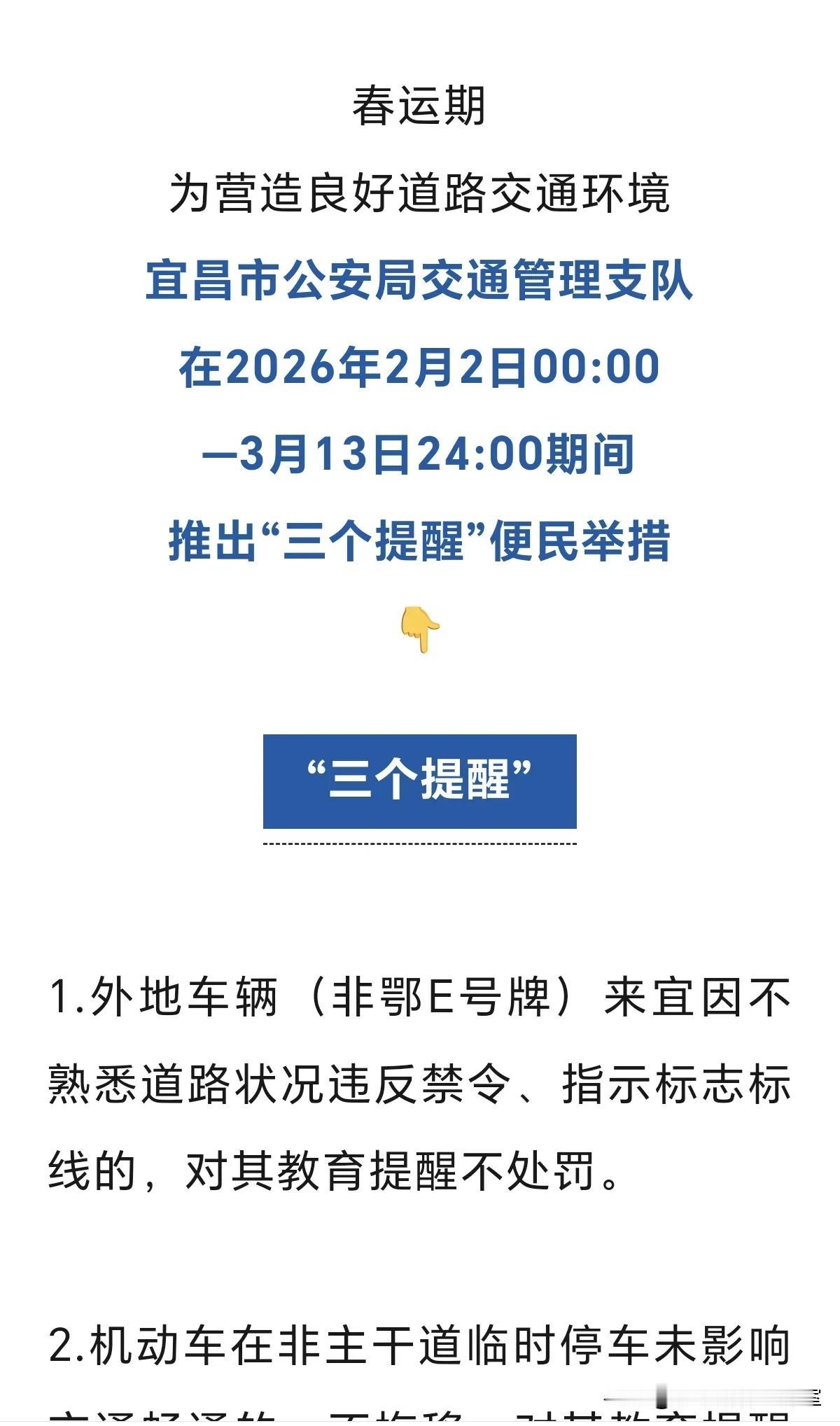 春节期间,宜昌执行人性化的交通执法!实施细则暖心!机动车驾驶员的福音! 春运期,宜昌市公安局交通管理支队在2026年2月2日00:00开始,至3月13日24:00期间 1、外地车辆(非鄂E号牌)来宜因不熟悉道路状况违反禁令、指示标志标线的,对其教育提醒不处罚。 2、机动车在非主干道临时停车未影响交通畅通的,不拖移、对其教育提醒不处罚。 3、新购机动车临时号牌超过有效期在15日内的,对其教育提醒不处罚。看到以上这些交通执法的实施细则,广大的网友有怎样的看法?欢迎在下方留言!