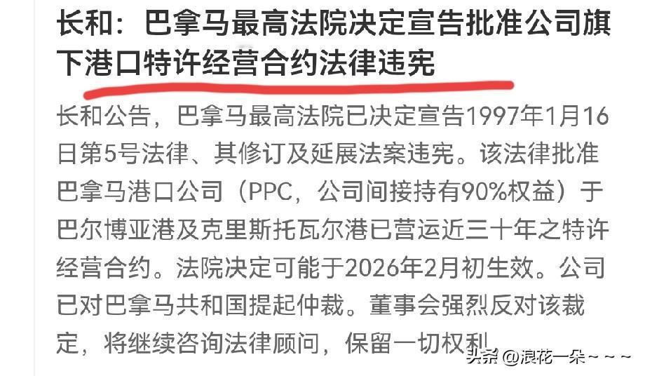 就在刚刚, 长河公告:巴拿马最高法院决定宣告批准公司旗下港口特许经营合约法律违宪。公司已经决定对巴拿马共和国提起仲裁。 此前,也就是2026年1月29日,巴拿马最高法院裁定长江和记实业(长和)旗下子公司运营巴拿马运河两端港口——巴尔博亚港与克里斯托瓦尔港的特许经营合同“违宪无效”,立即生效且不得上诉。该裁决推翻了自1997年起长达近30年的合法运营权,并否定了2021年经巴拿马政府批准的续约至2047年的协议。 这次长河对巴拿马共和国提起仲裁,合理合法有依有据,是对巴拿马执政者违反巴拿马宪法一次有力反击。其实,巴拿马老百姓也应该看得很清楚,如果巴拿马最高法院不撤回裁定的话,必将迎头痛击,最终受伤害的还是巴拿马老百姓。 当然,不得不说,巴拿马最高法院作出如此不依法行事的行为,背后是受霸权的驱使,屈服了霸权国家的淫威。就这种不作为,以后其他国家还怎么敢跟巴拿马做生意?屈服于他人受伤的最终还是自己的人民,骑驴看唱本,走着瞧吧。