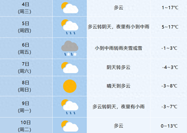 4日(周三):沿淮淮河以北多云,淮河以南晴天转阴天。
