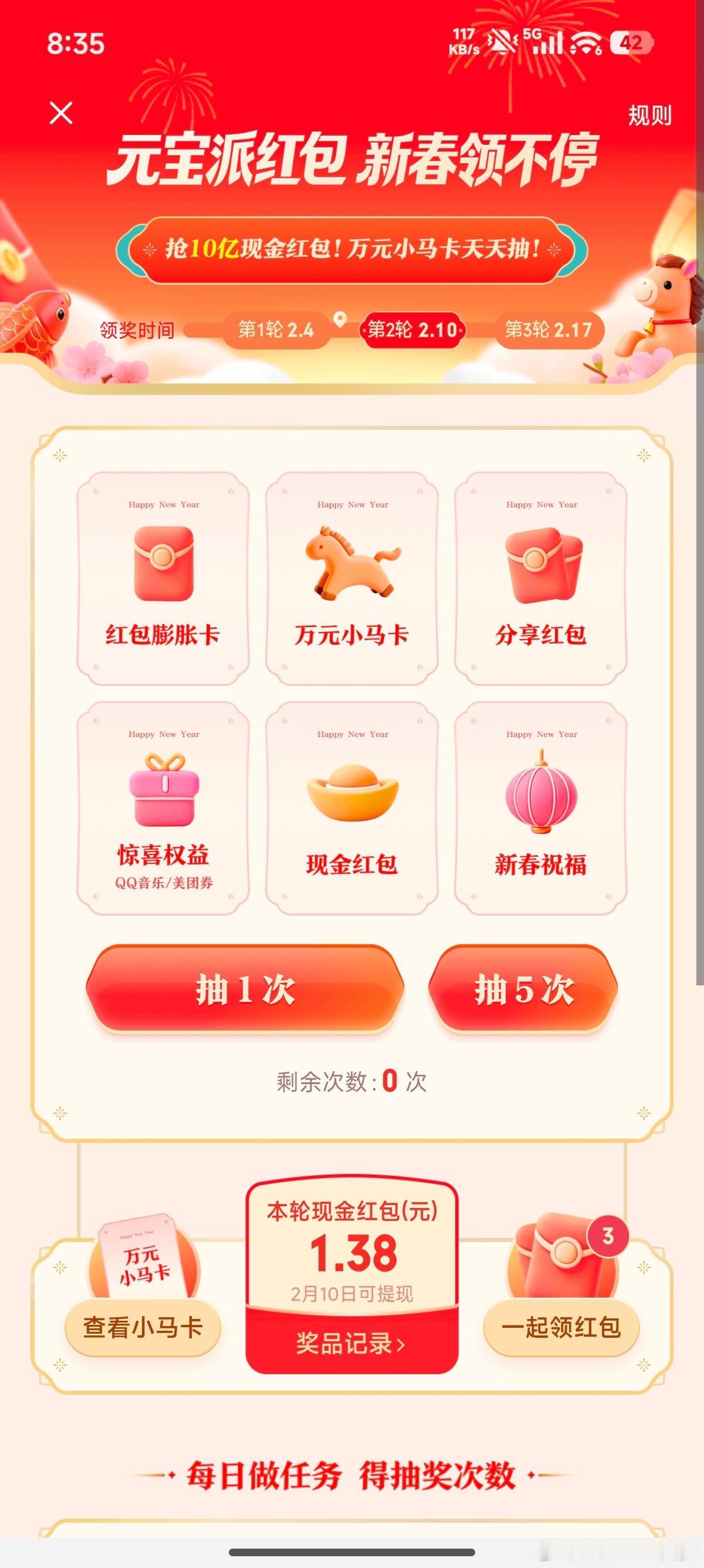 元宝瓜分红包今天就开启第二轮了,第一轮的红包会24小时内自动到账零钱,我的已经拿到了速度还挺快的但参加第二轮的时候明显就是几毛几毛的给,还抽到很多福卡一轮下来总计才一块多…第一轮参加的时候就直接有五块🖐🏻…果然,还是同样的🎣玩法