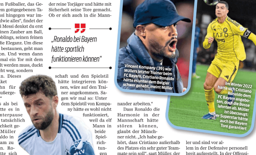 与梅西的情况不同,在2022/23赛季的冬歇期,穆勒和C罗原本有机会在同一支球队效力。2022年11月,C罗与曼联俱乐部决裂,双方同意立即解约。随后,C罗告知拜仁慕尼黑管理层,拜仁慕尼黑是他考虑的转会目标之一。