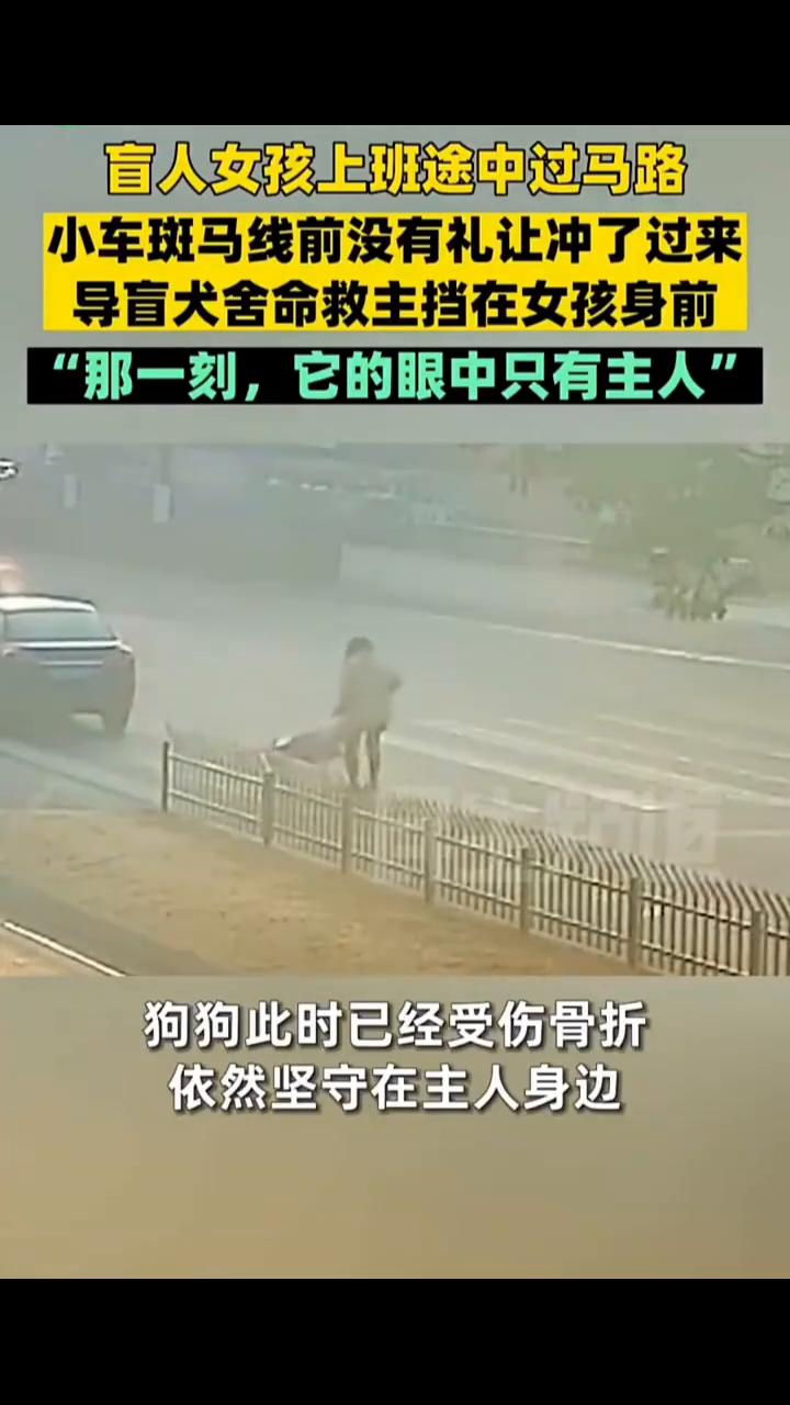 小车斑马线前没有礼让冲了过来,导盲犬舍命救主挡在女孩身前。 盲人女孩上班途中过马路,"那一刻,它的眼中只有主人"。事发江苏张家港,危急时刻狗狗挡在了女孩身前,女孩摔倒在地,摸着狗狗站了起来。狗狗此时已经受伤骨折,依然坚守在主人身边,为勇敢忠诚的狗狗救治。 女孩表示:自从有了狗狗,自己的生活有了很大的改变。同时呼吁:希望开车的人能小心一点。 民生频道。