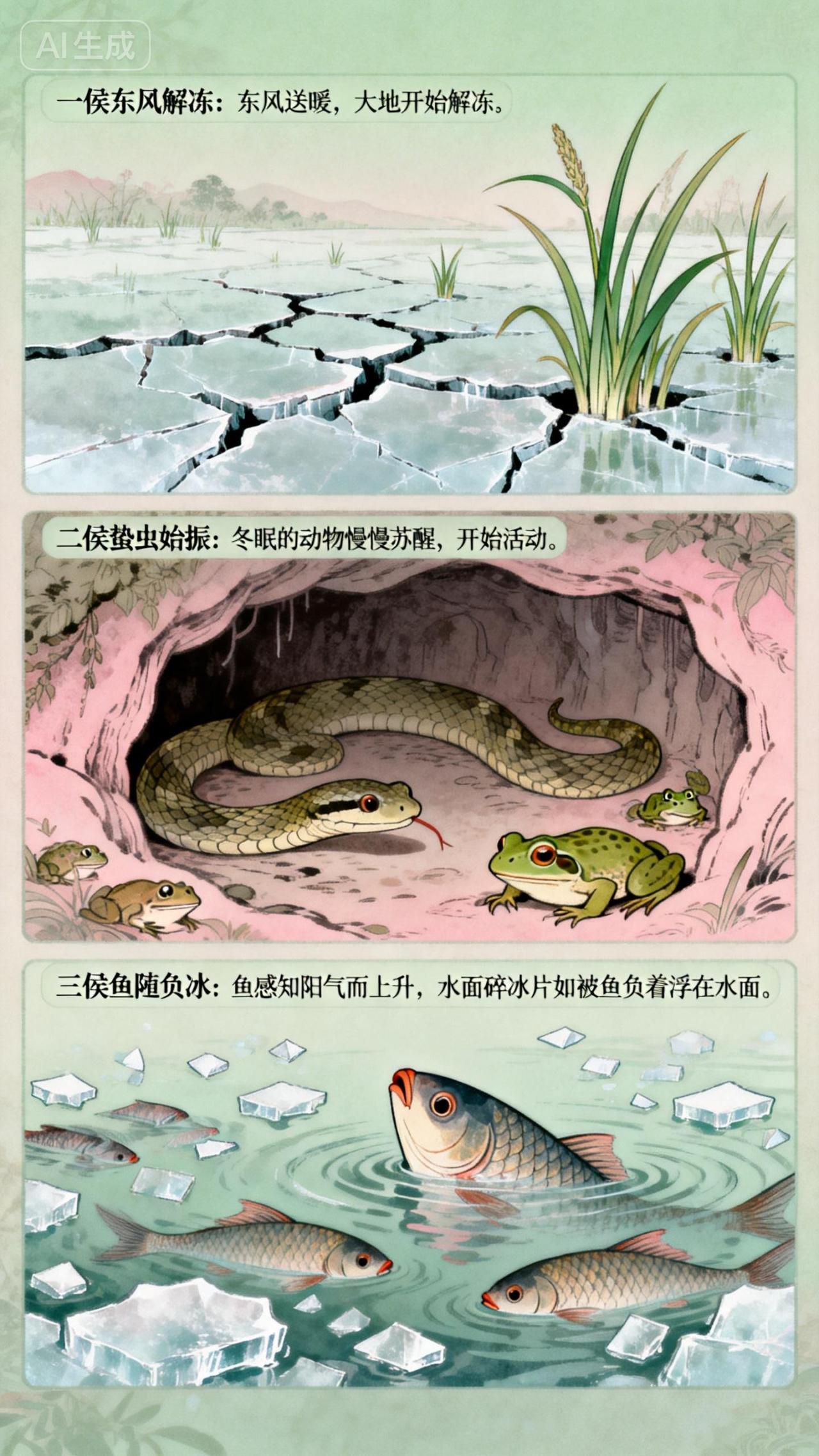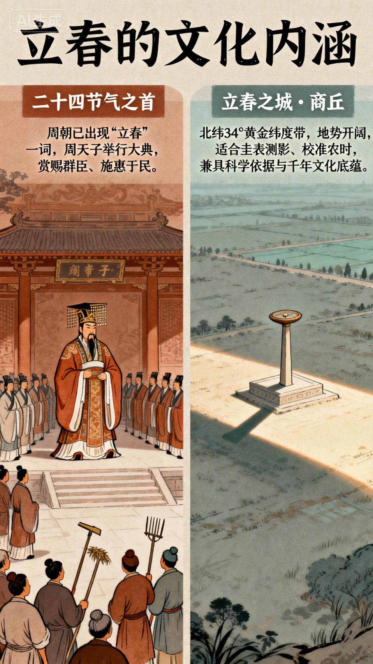 今天立春不简单! 1. 2026年立春的特殊性 2026年2月4日立春被称为“60年一遇”,因其多个节气特征交汇。它是“早立春”,在凌晨4点多交节,意味着阳气生发更早、更旺盛,利于农作物复苏和气温回升。 该立春卡在“蛇尾马头”的关键节点,是蛇年双春年的“收尾春”,遇上蛇尾马头春,有“福叠福”之意,且仍属乙巳蛇年,不是马年春。 2. 立春三侯 一侯东风解冻:东风送暖,大地开始解冻。 二侯蛰虫始振:冬眠的动物慢慢苏醒,开始活动。 三侯鱼陟负冰:鱼感知阳气而上升,水面上还有没完全融化的碎冰片,如同被鱼负着一般浮在水面。 3. 立春习俗 迎春:周朝时天子率众到东郊举行迎春盛典,祈求国泰民安;现在人们喜欢在立春前后出门踏青。 打春:也叫“鞭打春牛”,用鞭子抽打泥土做的牛,以祈愿五谷丰登。 报春:立春前一日由两名春吏沿街高喊“春来了”,人们见了春官要作揖礼谒。 咬春:在立春这天吃春饼、春卷、萝卜等食物,寓意有头有尾,且这些食物有辛甘发散之效,利于生发和保护阳气。 4. 立春养生 起居:遵循“春捂秋冻”原则,重点保暖颈部、腰部和脚部;顺应阳气生发规律,从“早睡早起”调整为“晚睡早起”,保证充足睡眠。 饮食:宜清淡,避免辛辣、油腻、生冷食物,多吃韭菜、菠菜、黄芽菜、萝卜等当季春菜,还可适当喝些花茶,如菊花茶、茉莉花茶。 情志:保持心胸开阔、心境愉悦,避免暴怒和忧郁,多到户外走走,舒缓情绪,让身心与春气同频。 5. 立春的文化内涵 立春是二十四节气之首,早在三千年前的周朝就已出现“立春”一词。周天子会在立春举行大典,赏赐群臣并施惠于民。 “立春之城”商丘,是二十四节气的重要起源地,有科学依据与千年文化底蕴,地处北纬34°黄金纬度带,地势开阔,适合圭表测影、校准农时。 不同朝代对迎春仪式十分重视,周朝天子斋戒迎春,宋代官员入朝称贺,清代有呈进春牛图并打春的习俗。