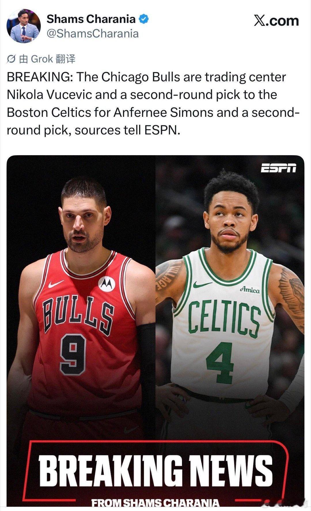 凯尔特人公牛交易凯尔特人送出西蒙斯+次轮签,从公牛换得武切维奇+次轮签。此举成功将球队总薪资降至奢侈税线下,节省超2000万罚金,同时补强了首发中锋位置,实现降税与内线升级的双重目标。全网热点共创计划