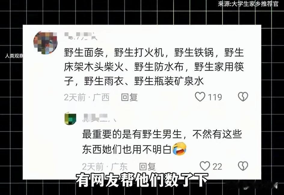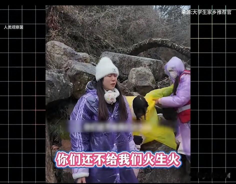 到底是谁想出来的全女野外生存? 这不是开玩笑吗? 几名女大学生参加了这个节目, 结果还没生存, 就开始针对节目组了, 穿紫色雨衣的女子, 居然对着节目组破口大骂, 你们什么都不帮我们, 只知道扛着个摄像机拍呀拍, 连火都不帮我们生, 每天的饭吃不好,觉也睡不好, 说着就对着摄像大哥发怒, 让大哥不要拍了, 野外生存让这些女大学生崩溃了, 还有女生居然指责节目组, 这么冷的天居然让我们用溪水做饭, 经过她们的抱怨, 节目组只好给了她们打火机, 还给她们带来了面条, 然后她们就吃上了野生的面条, 差点让人忘记了这是一个野外生存节目,全女野外生存简直像过家家! 这样的节目主打就是搞笑, 能想出来让全女大学生参加野外生存的绝对是个人才, 节目的搞笑效果直接被拉满了, 网友纷纷建议她们原地解散, 别人的野外生存都是吃野生水果, 自己找食物, 全女野外生存居然有打火机和挂面, 简直是来这里野外交游的! 幸亏只是野外生存节目, 要是真的野外生存全女团队估计得全军覆没! 大家对于全女野外生存节目怎么看? 野外生存 野外生存方式 荒野女生 荒野女生