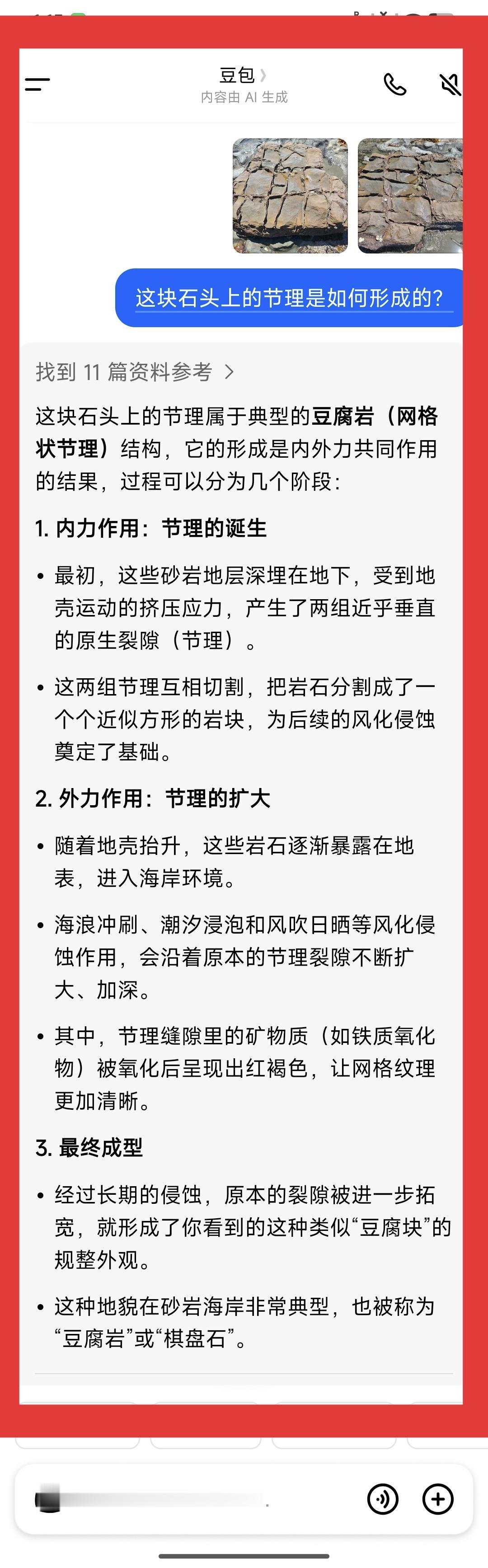 “豆腐岩”,你见过吗? 前几天,在奥克兰北区的海湾游览时,看见了这块罕见的“豆腐岩”,绕着它转了两圈,非常细心地观察着这块岩石上节理分布的情况。我在想,这块石头在亿万年前到底是怎么形成的? 说到石头上的“节理”这个概念,还是我在福建天姥山上游览时学习到的。石头上的节理,是在地壳运动时,不同的物质元素被熔岩挤压分割,夹杂在熔岩中间,最后形成石头时就显现不同的颜色条纹。 “豆腐岩”这个名字,还是第一次听说,也是豆包告诉我的。豆包介绍说:“这块石头上的节理是典型的豆腐岩(网络状节理)结构,它的形成是内外力共同作用的结果。” 内力的作用使节理诞生。这些砂岩深埋地下,受到地壳运动影响,形成相互垂直的裂隙,这样的裂隙,互相分割,就形成了近似方形的岩块。 外力的作用使节理扩大。随着地壳抬升,这些岩石逐渐裸露到地面和海边,在海浪的冲刷侵泡下,加之长年累月的风吹日晒风化作用,不同物质风化程度不同,节理就会加大和明显起来。 遇到“豆腐岩”,这学到一个新知识。不过这“豆腐岩”的图案还是很好看的哈!