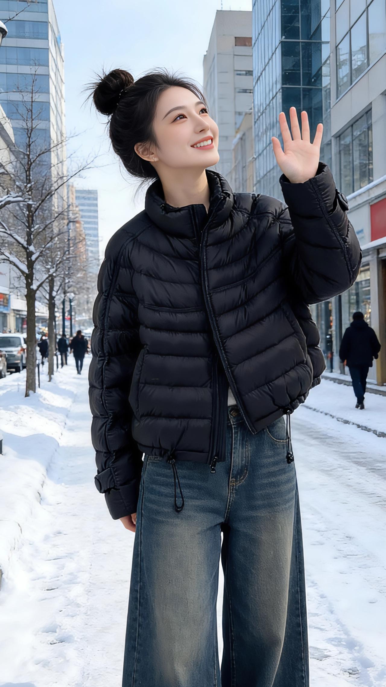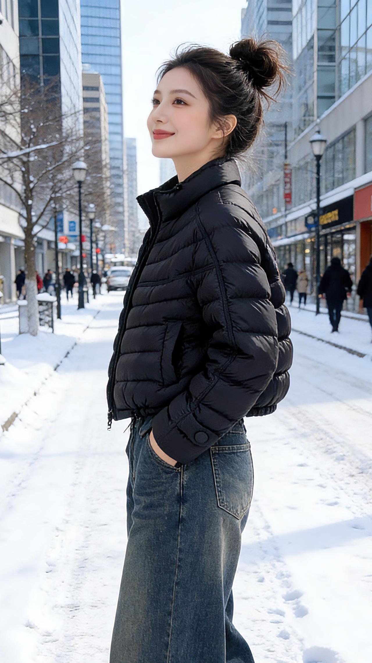暖黑与雪色 雪后的都市街道,被日光洗得发亮。她裹着短款的黑色羽绒服站在雪地里,像一颗被暖起来的小炭球,蓬松的衣身把寒风都隔在外面,只露出一截宽松的牛仔裤裤脚,扫过积着薄雪的地面。 她把双手揣进衣兜,下巴轻轻扬起,阳光落在羽绒服的绗缝纹路里,泛着细腻的光泽。偶尔抬手比出一个轻快的V字,或是用冻得微红的指尖拢住头发,把蓬松的丸子头揉得更乱些。最动人的是她笑着比心的模样,羽绒服的蓬松让这个动作添了几分软乎乎的可爱,和冷冽的街景撞出温柔的反差。 风穿过楼宇的缝隙,卷起细碎的雪粒,落在羽绒服的肩头上。她却毫不在意,脚步轻快地踩过雪水,牛仔裤的裤脚沾了点湿痕也没关系——毕竟在这样的冬日里,一件暖和的外套,一份松弛的心情,就足够把寒冷都酿成温柔的底色。 高级感穿搭 冬季穿搭 新年穿搭 羽绒服