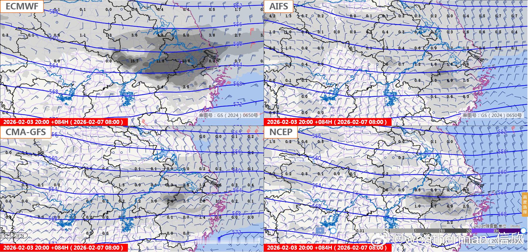 但是数值预报对于这个降雪的强度分歧还是很大。欧洲报依然最强,但比之前又略调弱。我国报、美国报还是比欧洲报的降雪偏少。从降水总量预报看,也是欧洲报最强。未来继续观察。
