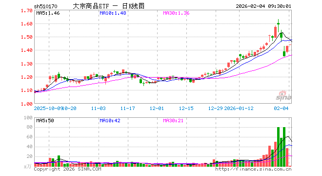 2月4日,大宗商品ETF(510170)开盘涨0.70%,报1.440元。大宗商品ETF(510170)重仓股方面,江西铜业开盘涨3.00%,恒力石化涨1.82%,白银有色跌6.96%,厦门钨业涨2.88%,华鲁恒升涨0.33%,紫金矿业涨1.78%,中国巨石涨0.29%,金钼股份涨1.72%,南山铝业涨1.61%,山东黄金涨0.39%。