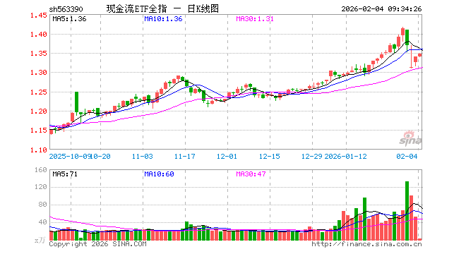 现金流ETF全指(563390)业绩比较基准为中证全指自由现金流指数收益率,管理人为华泰柏瑞基金管理有限公司,基金经理为胡亦清,成立(2025-04-23)以来回报为34.04%,近一个月回报为5.43%。