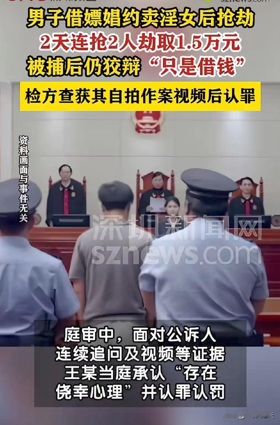 辽宁沈阳,男子以客人身份,在网上发布暧昧邀约信息,很快,一失足女主动联系了他。到了约定的地点,男子并没有着急进行下一步,反倒以各种理由强行问女子借钱,遭到拒绝后,他突然变脸,用手臂勒住女子颈部,威胁她给钱,不然就弄 死她,女子吓个半死,东拼西凑转给对方5000元。尝到甜头后,男子故技重施,次日又从另一失足女身上弄来10000元。本以为失足女不敢报警,谁知,警方很快找上门来。 王某平日里游手好闲,兜里没几个钱,可他又不愿意踏踏实实去找工作,满脑子净想着不劳而获。 思来想去,他把那歪主意打到了失足女身上。 他觉得,这些失足女干这见不得光的营生,手里有钱,就算出了事,肯定也不*敢声张,从她们身上弄点钱应该挺容易。 2025年7月16日,王某开始行动了。他先在网上以客人的身份发布了一条暧昧邀约信息,没过多久,女子盛某果然联系了他。 两人在网上谈好了交易费用和见面地点,王某心里暗喜,觉得这钱已经到手了一半,便急匆匆地赶往约定地点。 到了地方,盛某果然是一个人赴约,王某立马变了脸,压根没打算按照之前约定的交易流程走。 他先开始编造理由,说盛某不守时,让他等了很久,耽误自己不少事,一会儿又说,自己手头紧急需周转,厚着脸皮向盛某强行借钱。 天下哪有这样的事,自己是出来挣钱的,一毛没挣反倒被借钱,太离谱了,于是她坚决拒绝。 王某见软的不行,瞬间恼羞成怒,突然伸出手臂,用力勒住盛某的颈部,嘴里还恶狠狠地放话,说不给钱就弄死她。 盛某被勒得喘不上气,身体也吓得浑身发软,她只身一人,要是不给他钱惹怒了对方,只怕自己小命不保 考虑到自身安全,盛某没办法,只能妥协,通过微信、银行卡等方式,转给王某5000多元,整个过程,王某还拍摄了视频。 尝到了甜头,王某觉得这钱来的真是容易,次日,他又故技重施,用同样的暴力胁迫手段,从另一女子商某那里弄来10000元,然后逃之夭夭。 本想着拿着这些钱,自己能逍遥一阵子了,但法网恢恢,疏而不漏,很快,警方就找上门来。 随后,检察院以涉嫌抢劫罪对王某提起了公诉。 法庭上,王某满脸懊悔,对自己的犯罪行为供认不讳,表示当时自己被贪念冲昏了头,又心存侥幸。 但铁证如山,为时已晚,他终究要为自己的犯罪行为付出代价。 《刑法》第263条规定:以暴力、胁迫或者其他方法抢劫公私财物的,处三年以上十年以下有期徒刑,并处罚金。 王某以非法占有为目的,先以交易邀约诱骗被害人见面,随后当场使用勒颈等暴力手段、以“弄死她”相威胁,迫使两名被害人分别转账5000余元与10000元,完全符合抢劫罪构成要件 。 即便被害人从事非法活动,其人身权与财产权仍受刑法平等保护,王某的行为同时侵犯人身与财产双重法益,且连续作案、主观恶性明显,依法应以抢劫罪定罪处罚。 从司法认定看,王某不存在入户、持枪等法定加重情节,结合其坦白认罪情节,法院将在三年以上十年以下有期徒刑幅度内量刑,并处罚金。