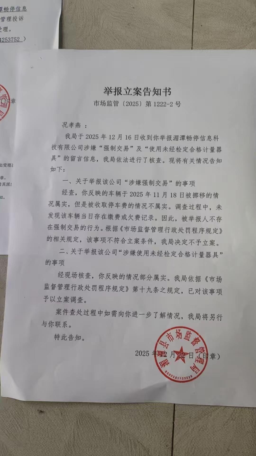 致敬贵州,贵州打响拆除路边智慧停车收费设备第一枪!偏僻的贵州反而有勇气开个好头[赞][赞][赞][赞]全国人民感谢贵州遵义湄潭县这位执着的况女士!(图1-2) 贵州遵义市湄潭县况女士非常爱惜自己的爱车,2025年11月18日她停在马路边去办事,回来看一下爱车下面的智慧停车设备档板自动升起来,损伤了她的爱车底盘!(图3) 遇到这种情况,大部分市民可能只会忍一忍,扫码缴费,让停车位的自动升降设备降下去,把车开走回家! 但是这位况女士非常爱惜自己的爱车,也非常执着,开始走上投诉、维权之路,打市长热线12345,找市场监督管理局维权!(图4) 遵义市湄潭县市场监督管理局工作效率也不错,对况女士的维权投诉给予回复: 1,涉嫌强制交易:经查2025年11月18号,况女士的车被挪移属实,但是被收取收费不属实,因为当天此车没有缴费/欠费记录,所以不存在强制交易的行为,不予立案。 2,涉嫌使用未经检定合格计量器具:经查况女士反映的行为,经现场检查,情况属实,给予立案!(图5) 放眼全国,这种涉嫌强制交易的,基本上存在啊,停了车超过半小时,不管你同不同意,都是要收费。况女士这个维权第一条不属实,可能她停车没有超过半小时,但是她的车还是被损伤了,所以她的维权第二条,这个停车收公司的设备是不合法的,未经检定合格的计量器具,给予立案! 经过遵义市湄潭是市场监督管理局一查,发现这个收费公司仅仅成立注册才三天,就获得了这个路边停车收费公司的运营资格,这个就有点夸张了。按道理,这样大的流水运营公司谁都想做啊,为什么这个公司才成立三天,三天却可以获得这个经营权,那你想一下,这里面的猫腻有多大,专门为这个停车收费而成立一个公司?! 如果公开、公正、合法招标的话,成立三天的公司怎么可能获得这样路边停车收费的运营权?那么这个公司跟这个政府管理机关是不是有其他不合法的行为?!能经得起检查吗?! 贵州省遵义市放在全国相对是比较偏僻的一个城市,但是他们有勇气打响拆除路边停车收费这个设备的第一枪,要致敬!我们广东佛山是不是也要学习?! (图片来源网络。如有侵权,请联系删除)