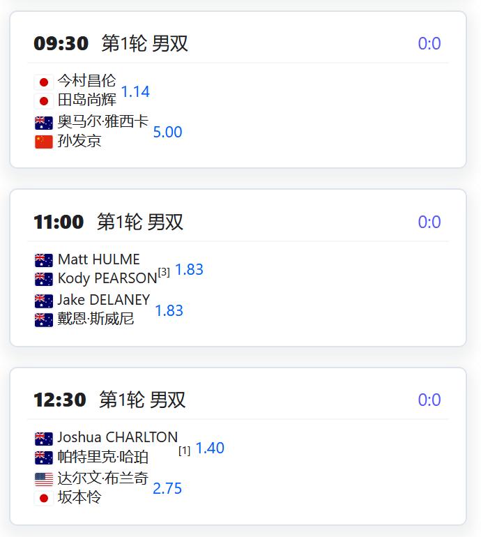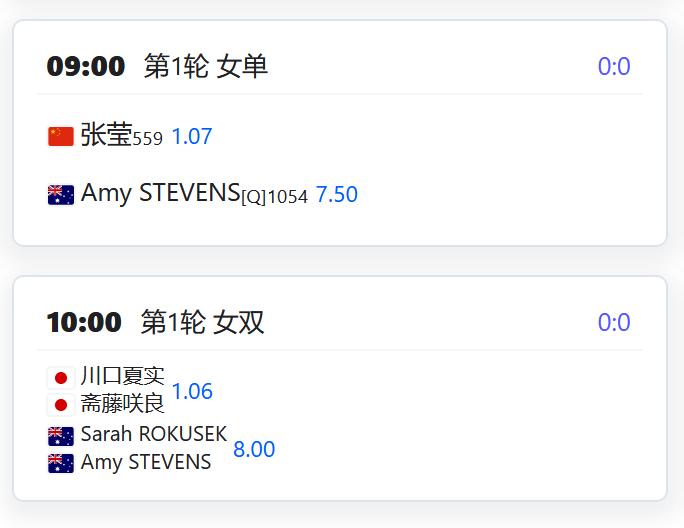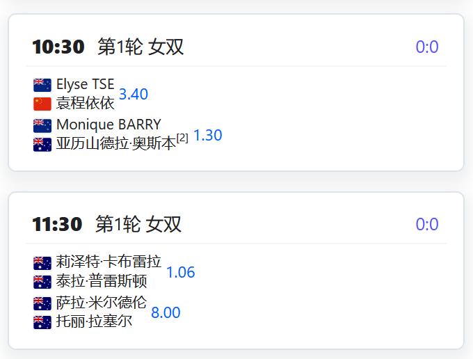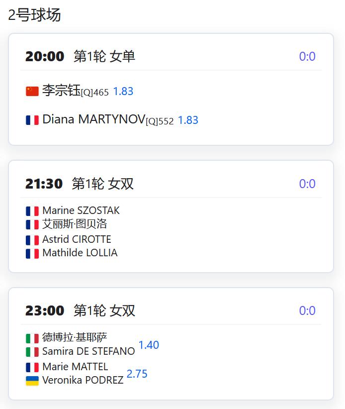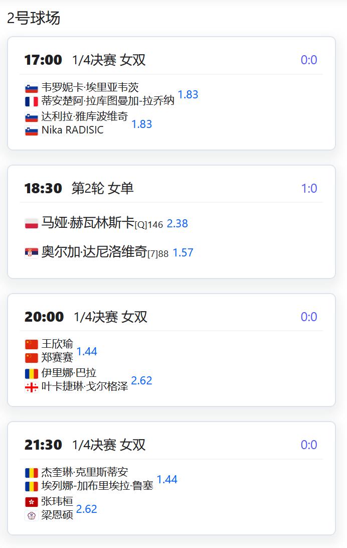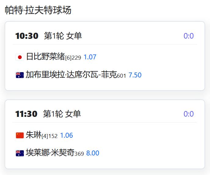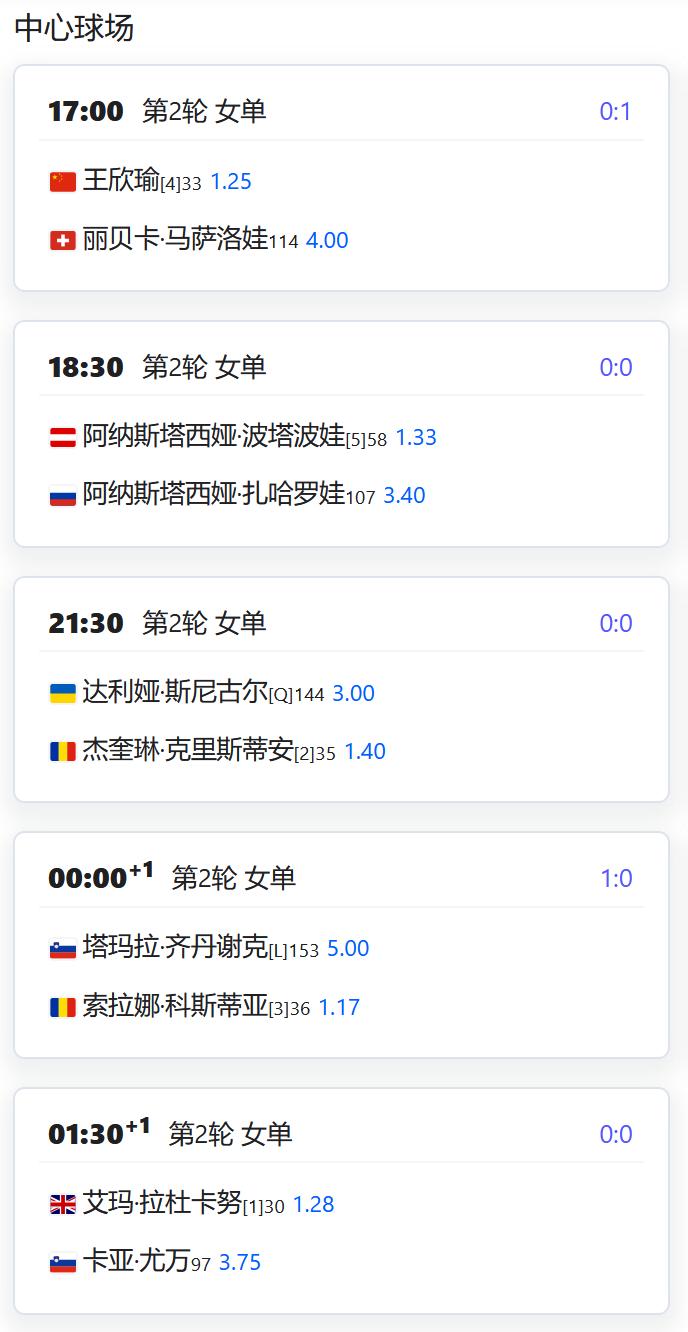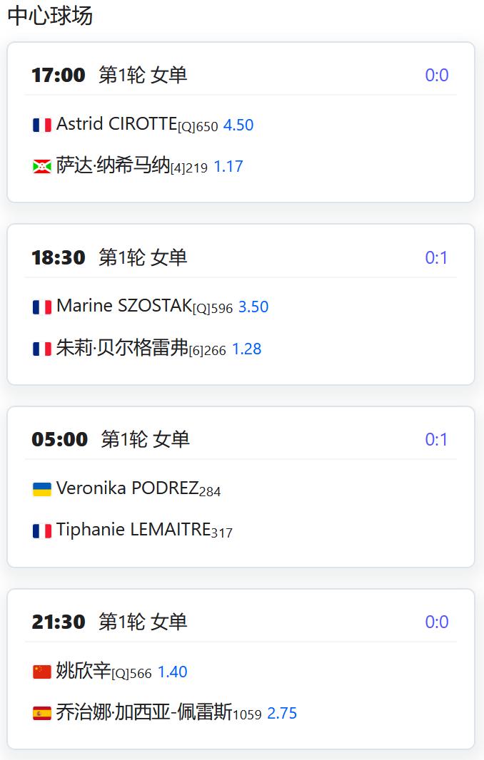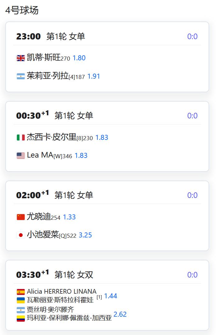 今日赛程: WTA500赛阿布扎比站,张帅搭档布克沙出战女双,首轮对阵基切诺克姐妹; WTA250赛克卢日纳波卡站,女单第二轮,王欣瑜将对阵马萨洛娃; 稍事休息后,还将搭档郑赛赛出战女双四分之一决赛,对阵巴拉/戈尔格泽; CH75布里斯班,男双第一轮,孙发京搭档雅西卡对阵日本组合今村昌伦/田岛尚辉; W75布里斯班,女单第一轮,朱琳将对阵米契奇; 张莹将对阵资格赛球员斯蒂文斯; 女双第一轮,袁程依依组合将对阵2号种子; W75昂德雷济约-布泰翁,女单第一轮,从资格赛突围的姚欣辛将对阵西班牙的加西亚-佩雷斯; 杨一迪将对阵基耶萨; 李宗钰将对阵同样从资格赛突围的马蒂诺娃; W50奥兰多,尤晓迪将在女单第一轮对阵资格赛球员小池爱菜。