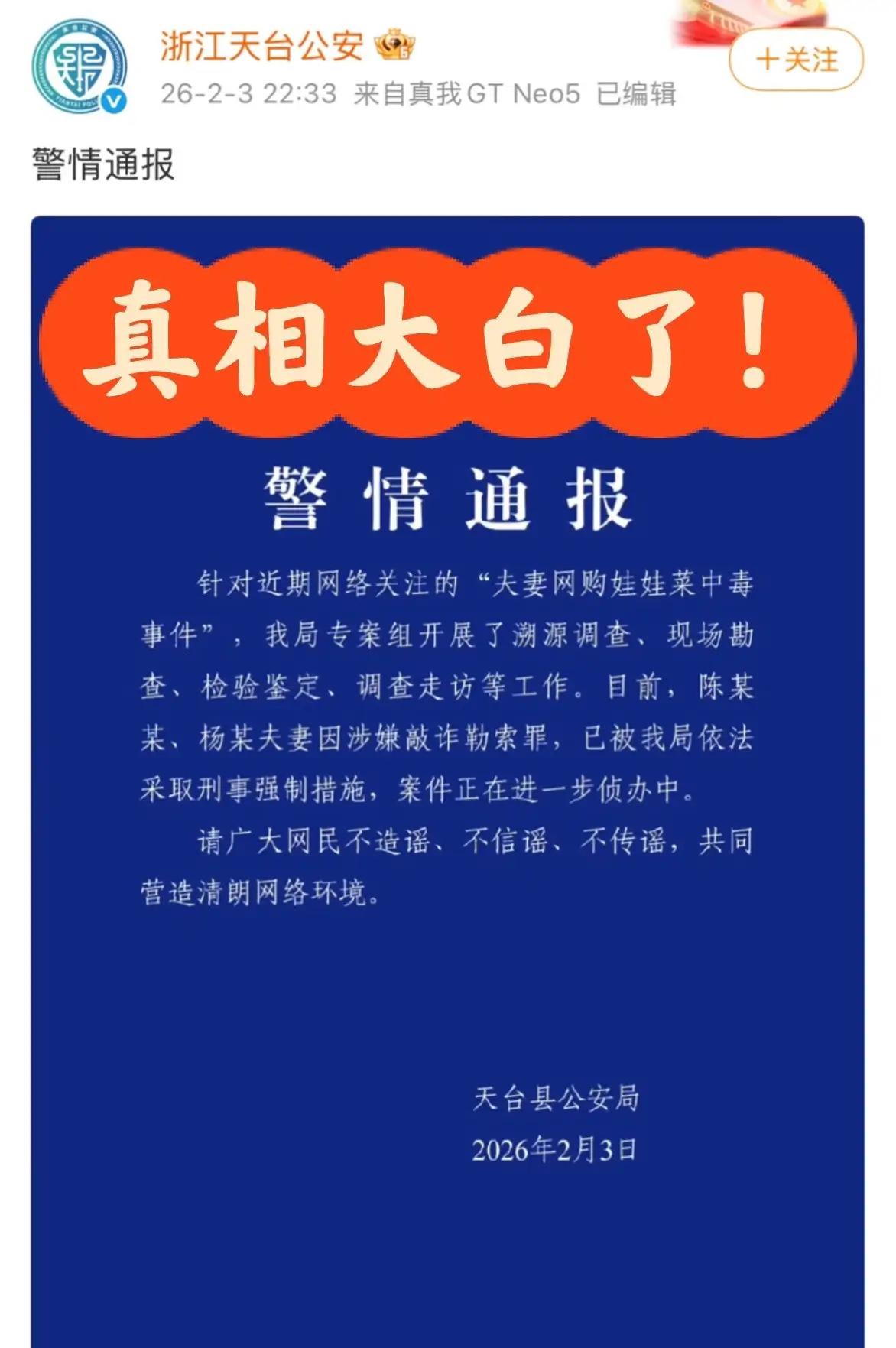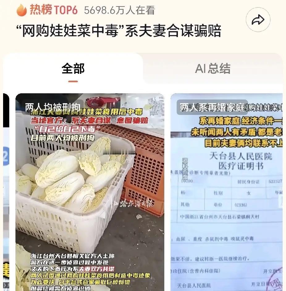 为了骗点赔偿,居然有人拿自己的命当赌注!浙江台州这对夫妻的操作,真是把愚昧和贪婪刻进骨子里了——花17.48元网购8斤娃娃菜,转头就往菜上洒杀鼠剂,故意制造中毒假象,想讹平台和商户的巨额赔偿,结果把自己双双送进ICU,最后还被警方刑拘,彻底玩脱了! 这对夫妻是二婚重组家庭,杨女士从贵州带着儿子远嫁浙江天台的陈某波,婚后又生了个女儿,一起过了十几年,女儿都上中学了,儿子也在外地上大学。不管是村支书还是邻居,都觉得他俩感情挺好,平时没听说有啥矛盾,陈某波看着也老实巴交,谁能料到两人背地里能一起干出这种荒唐事? 一开始听说夫妻俩“吃娃娃菜中毒”,大家还挺揪心,可警方一调查,直接曝出惊天逆转——根本不是什么网购蔬菜有问题,也不是丈夫给妻子下毒,而是两人共谋骗赔!为了点钱,他们居然敢拿生命开玩笑,把杀鼠剂往要吃的菜上撒,这种操作简直刷新认知下限。 后果也完全是咎由自取:杨女士被查出凝血功能障碍、慢性消化道出血,还引发了肺部感染、呼吸衰竭,差点就没救回来;陈某波也没好到哪去,两人在ICU遭了大罪,本想讹钱,结果医药费都得自己掏,最后还落了个刑拘的下场。 17块钱的娃娃菜,换来了ICU抢救、牢狱之灾,这笔账怎么算都亏到离谱!好好的日子不过,偏偏被贪婪冲昏头脑,想走歪门邪道发横财,最后只能自食恶果。都说“君子爱财,取之有道”,这种不顾性命的骗赔行为,不仅蠢,更是违法犯罪,真是既可怜又可恨。