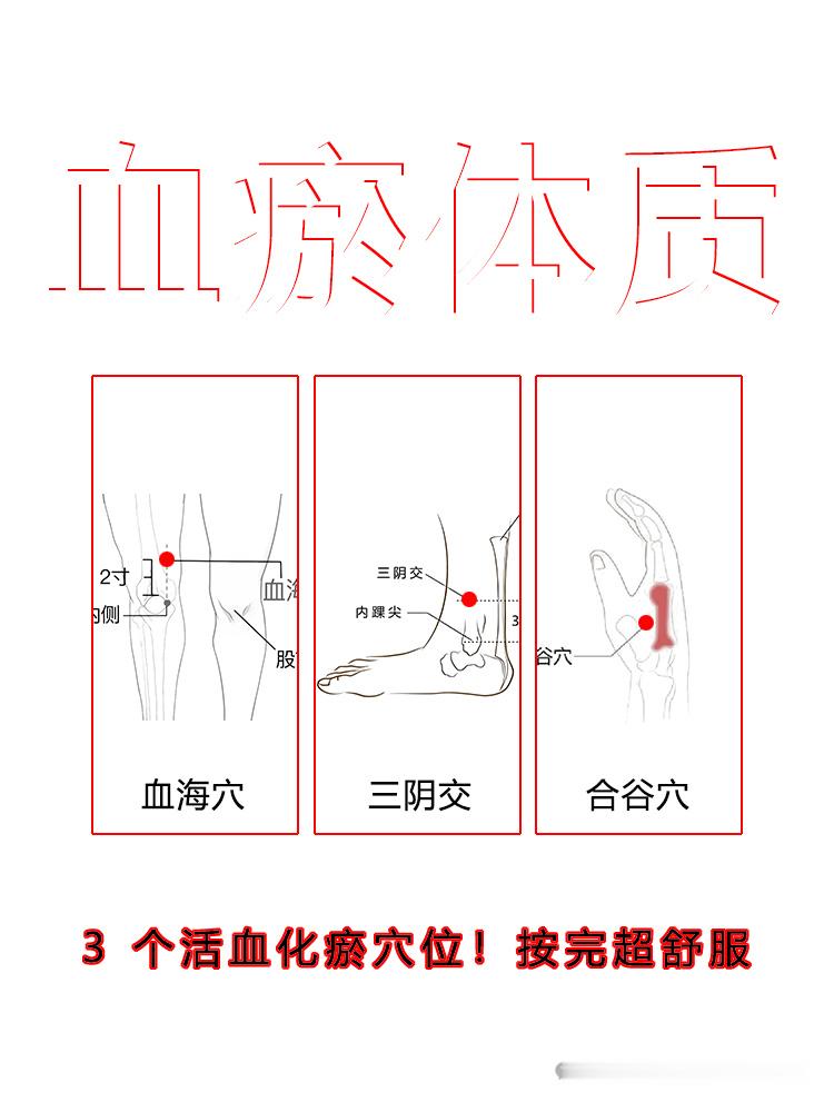 🌿血瘀体质是中医九大类体质之一,多由气滞、寒凝、久坐导致气血运行不畅,淤堵在体内。中医讲 “不通则痛、淤堵则色暗”,所以血瘀会引发疼痛、肤色暗沉、姨妈异常等问题,调理核心就是活血化瘀、温通气血,从穴位、饮食、日常习惯多管齐下,让气血顺畅循环~
