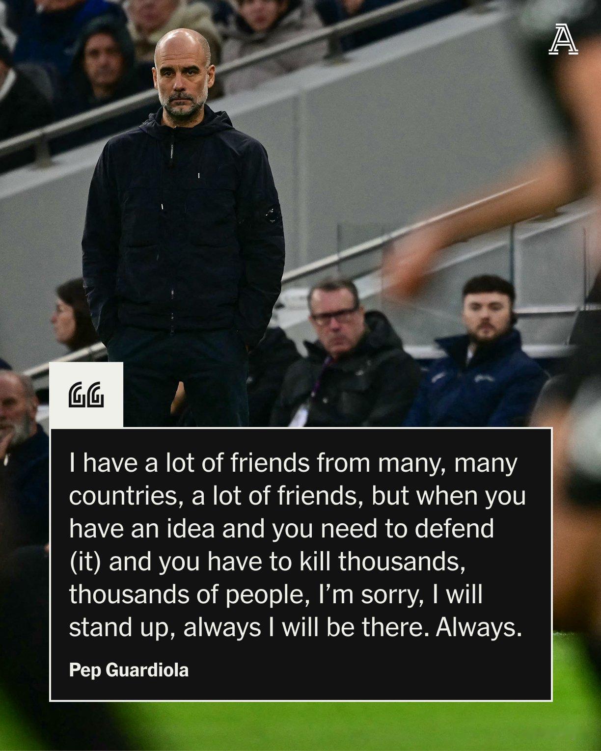 【大爱】瓜迪奥拉谈为何就巴勒斯坦、乌克兰、苏丹等地的事件发声👇: “我很感激这个提问,因为过去十年,或者说最近两年里,这是第一次有记者问我这类问题。感觉大家好像因为工作原因都不能谈这些,我不太清楚具体情况。” “但当你看到世界各地正在发生的那些画面,怎么可能无动于衷?这无关对错立场。每个政客,无论左翼右翼,难道会有人对每天发生的事情毫无触动吗?现在我们能亲眼看到这些,以前却不能。这让我感到痛心,对我来说真的很难受。无论受难的是哪一方,无论哪个国家遭受苦难,我都会感到痛苦。这无关立场。” “抱歉,这就是我的感受,大家可以讨论:当你看到成千上万的无辜生命被无情剥夺时,你不可能不痛心。道理就是这么简单。” “我有来自很多国家的朋友,但当你不得不面对成千上万、成千上万无辜平民被杀害的现实时——抱歉,我必须站出来,永远都会站出来。我无法想象,也没有人能做到无动于衷。当你每天看到那些画面,看到父亲、母亲、孩子的生活被彻底摧毁,人们怎么可能一点都不共情?抱歉,我真的做不到。”曼城