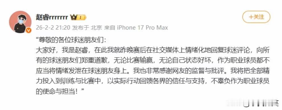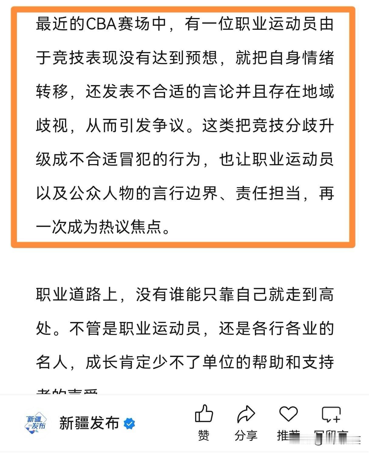 在年初的一场新闻发布会上,许利民指导就为何引进赵睿回答记者时这样说到, 这个孩子和过去相比较来讲,发生了很大的变化,这个变化不是不是在球技上,而是在整个的思想状态上,他能够由原来的一个个性突出的运动员,变成一个精神领袖,变成一个成熟的人。 看来许指导还是高看了赵睿,作为一名曾经的新疆队球员,作为现在的国家队队长,更作为一名合格的党员,发表这样的言论实属不该。 不过,赵睿随后也队自己的不当言论诚恳致歉。 没有新疆队的CBA不是完整的CBA,没有新疆人民,我们也就不是一个完整的大家庭。 对此《新疆发布》也不点名的批评了赵睿。