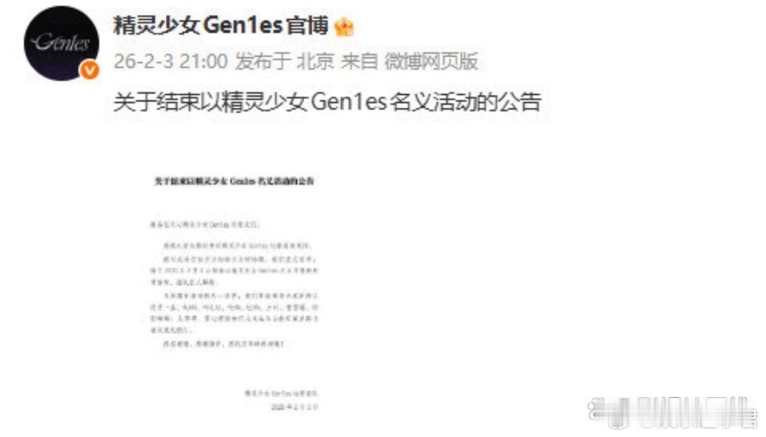 2月3日,精灵少女官博发布公告,官宣将从2月6日结束以组合名义开展的所有活动,团