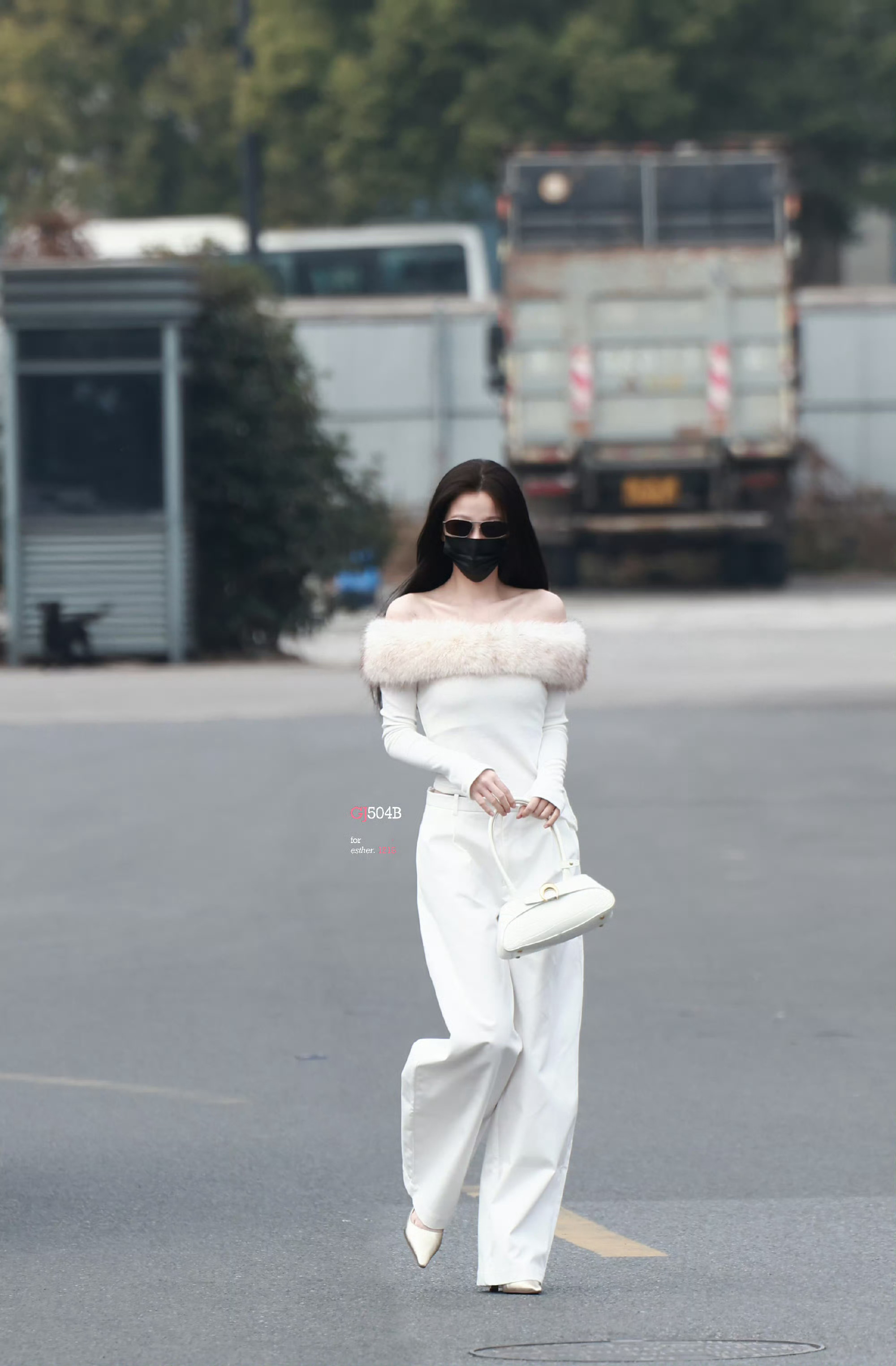 虞书欣黑长直白色毛领一字肩造型