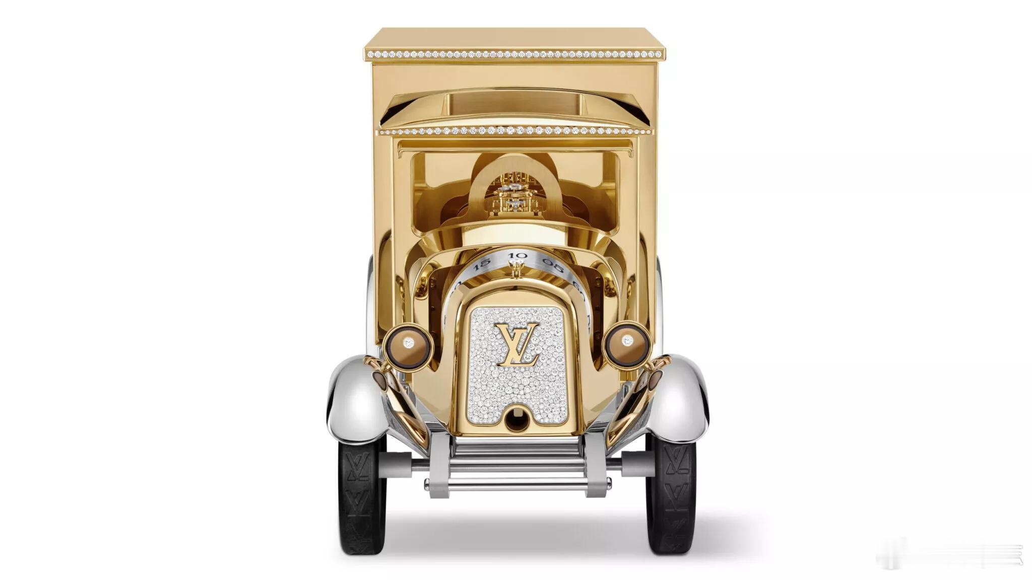 名车志新闻 【LV也造车了?】原来是卡车造型的桌面钟。· 这款名为 Camionnette 的限量版座钟,复刻 1920 年代 LV 配送货车造型,车身镀金还镶了 1695 颗钻石(总重 41.44 克拉),车头散热器上有颗 0.51 克拉的 LV 字母钻石;· 打开 “引擎盖” 藏着玄机 —— 双圆柱显示时分,手动上链的 MV.7417/101 机芯一次上弦能走 8 天,上链钥匙还收纳在迷你帆布行李箱里;· 全球仅 15 枚,定价约合人民币 480 万 +,预算有限也有 “平替款”:铝钢材质 + 品牌经典黄蓝配色,约 50 万 +就能拿下同款机械配置;· 一句话:这不是钟,是摆在书桌上的移动奢侈品圣殿。