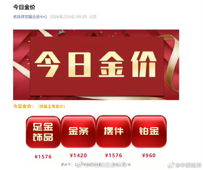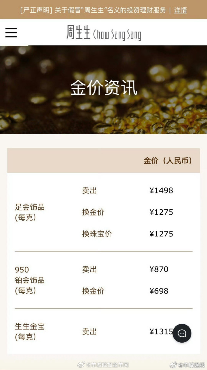 【#金饰价格涨到1600元##金饰克价一夜涨102元#】4日早间,现货黄金涨势不止,盘中再次突破5000美元大关,涨超1.2%。记者查询发现,周生生足金饰品报1600元/克,较前一日1498元/克涨102元。老庙黄金足金饰品报1571元/克,较前一日1498元/克涨73元。 老凤祥足金饰品报1576元/克,较前一日1518元/克涨58元。 #母亲盗卖儿子300万黄金为弟买房##连跌3日的金银暴力反弹##黄金回购也要限额了##金价白银期货#(中新经纬)