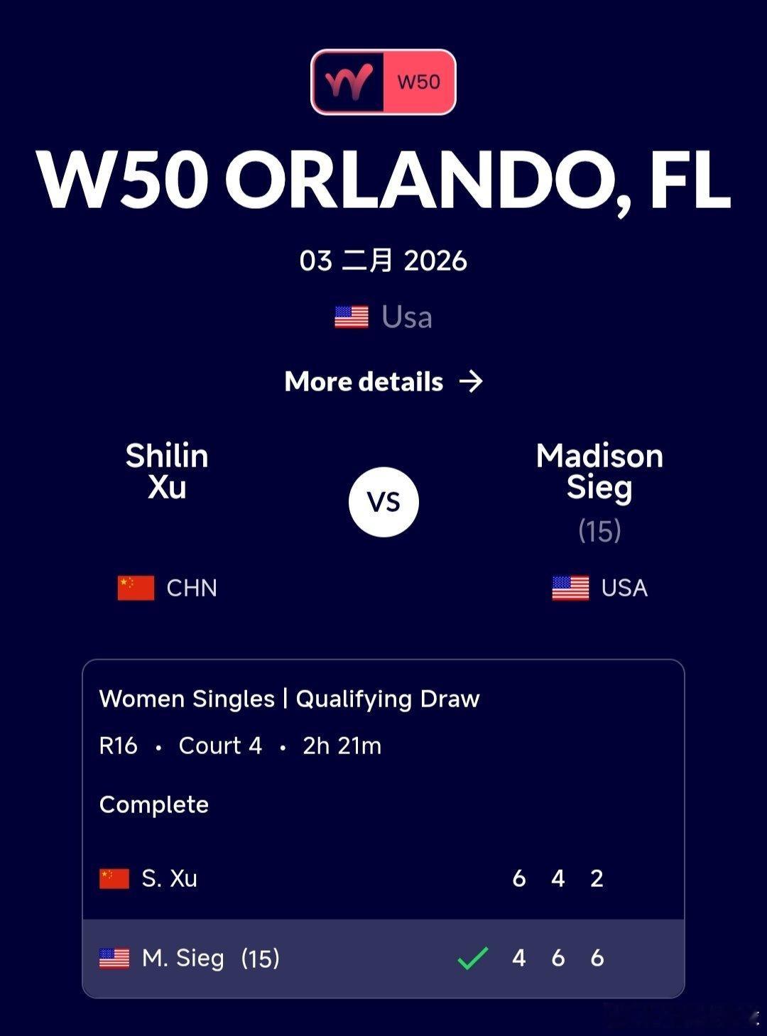 W50奥兰多站🇺🇸资格赛决胜轮韩江雪🇨🇳2-6/3-6不敌小池爱菜🇯?