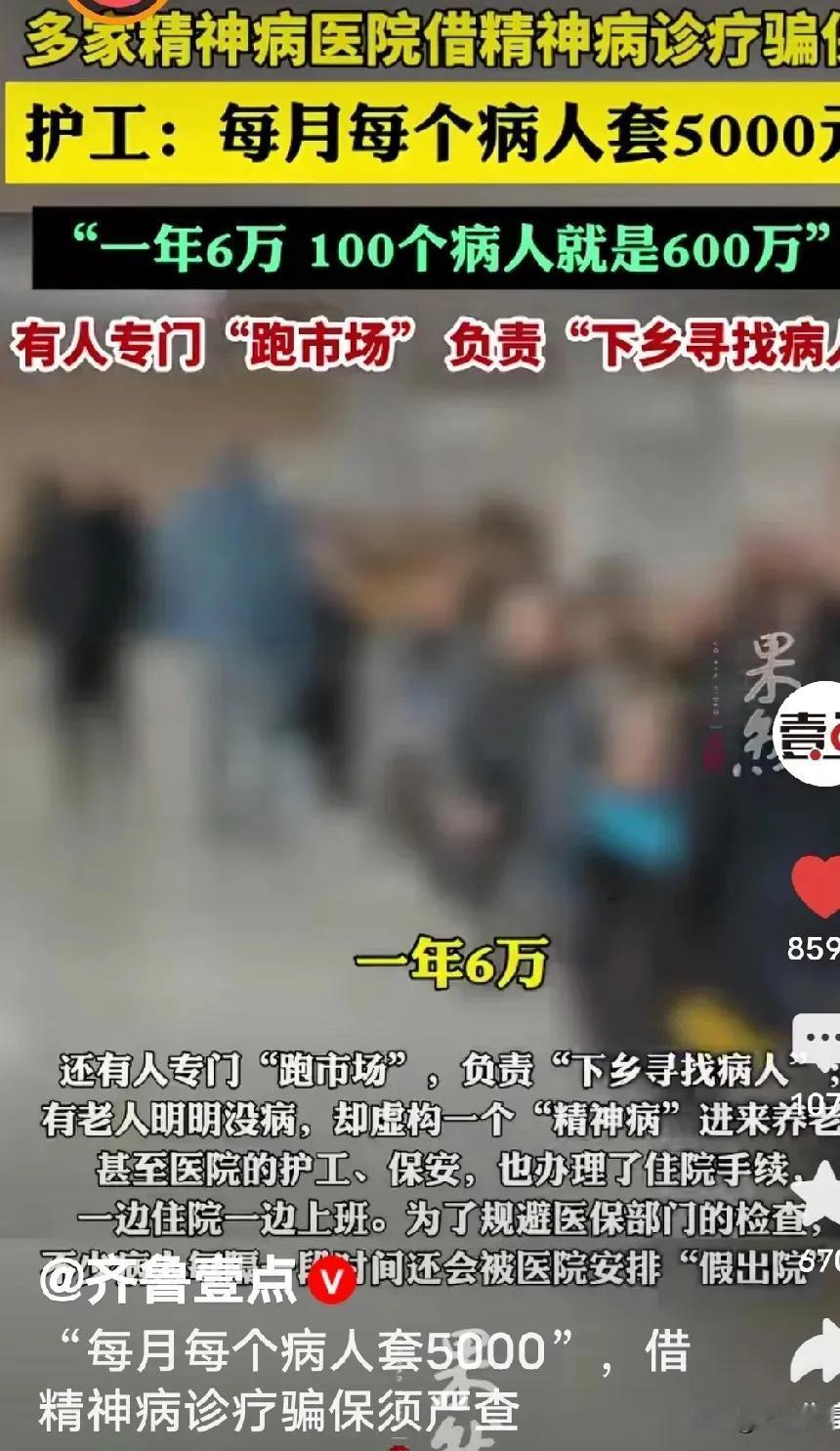 荒唐!襄阳竟然出如此怪事?匪夷所思,一个市居然有二十多家精神病院!里面病人有一半竟然是正常人,医保已经被掏空,一点自由也没有,被当作精神病人囚禁在医院里!曾有病人多次要求出院,请求无果后自杀! 很难想象,本该是救死扶伤、守护心灵的地方,会变成打着治病旗号的“赚钱机器”。记者卧底揭开的黑幕,比任何惊悚小说都让人脊背发凉。那些被硬塞进病房的普通人,可能只是村里独居的老人,或是和家人闹了矛盾的中年人,甚至还有医院自己的护工和保安。他们被贴上“精神病”的标签,不是因为真的患病,而是因为每个“床位”每月能给医院带来5000元的医保套现。一年6万,100个“病人”就是600万。 更让人愤怒的是,医院为了留住这些“摇钱树”,用尽了各种卑劣手段。病人病情好转想出院?没门。医护人员会用耳光、脚踹甚至水管抽打逼他们就范,美其名曰“治疗”。有人多次哀求出院无果,最终选择用自杀结束这场荒诞的囚禁。当治病救人的地方变成了人间炼狱,当白衣天使的外衣下藏着恶魔的心肠,我们不得不追问:这些医院是如何拿到资质的? 医保基金是老百姓的“救命钱”,却成了某些人眼中的唐僧肉。他们下乡“找病人”,虚构病情,甚至让医院员工“一边住院一边上班”,再通过“假出院”规避检查。这种系统性的诈骗,不仅掏空了医保基金,更击穿了社会的信任底线。 各位读者你们怎么看?欢迎在评论区讨论。