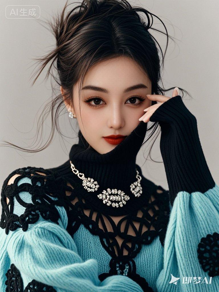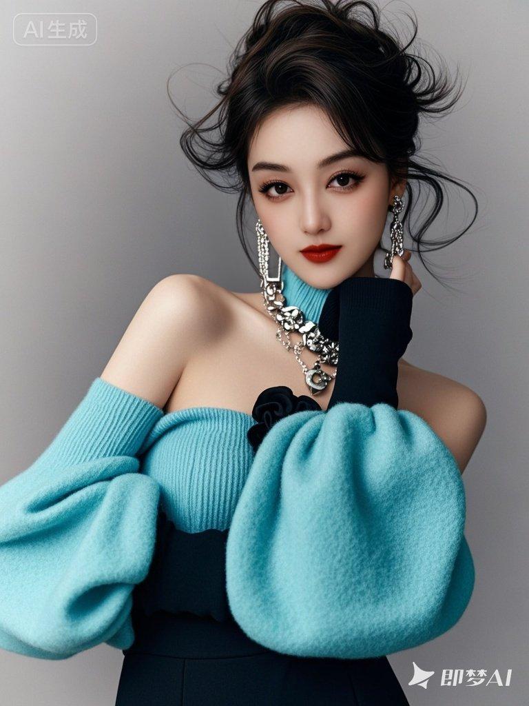 美女,优雅,,发丝柔顺有光泽,黑棕色长发凌乱盘起,浓眉大眼睛明亮有神,皮肤白皙,夸张配套首饰各种款式,舒服蒂芙尼蓝配极致黑颜色 衣服 ,搭配高档镂空勾立体花超高领羊毛宽松针织羊毛衫,一字肩,灯笼长袖