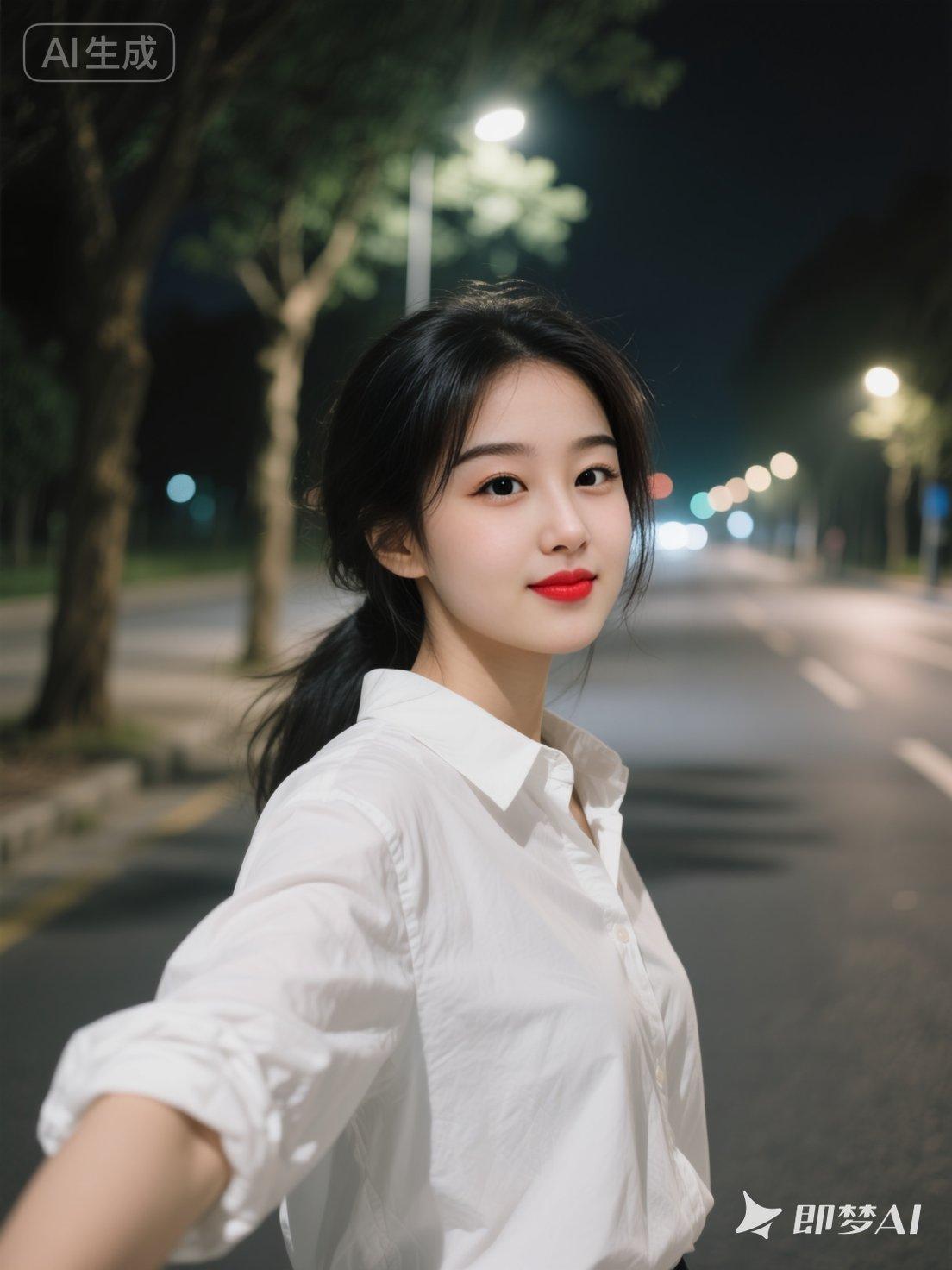 年轻女性,皮肤白皙,自然的妆,黑色长发头发飘飘稍显凌乱,穿着白色宽松衬衫