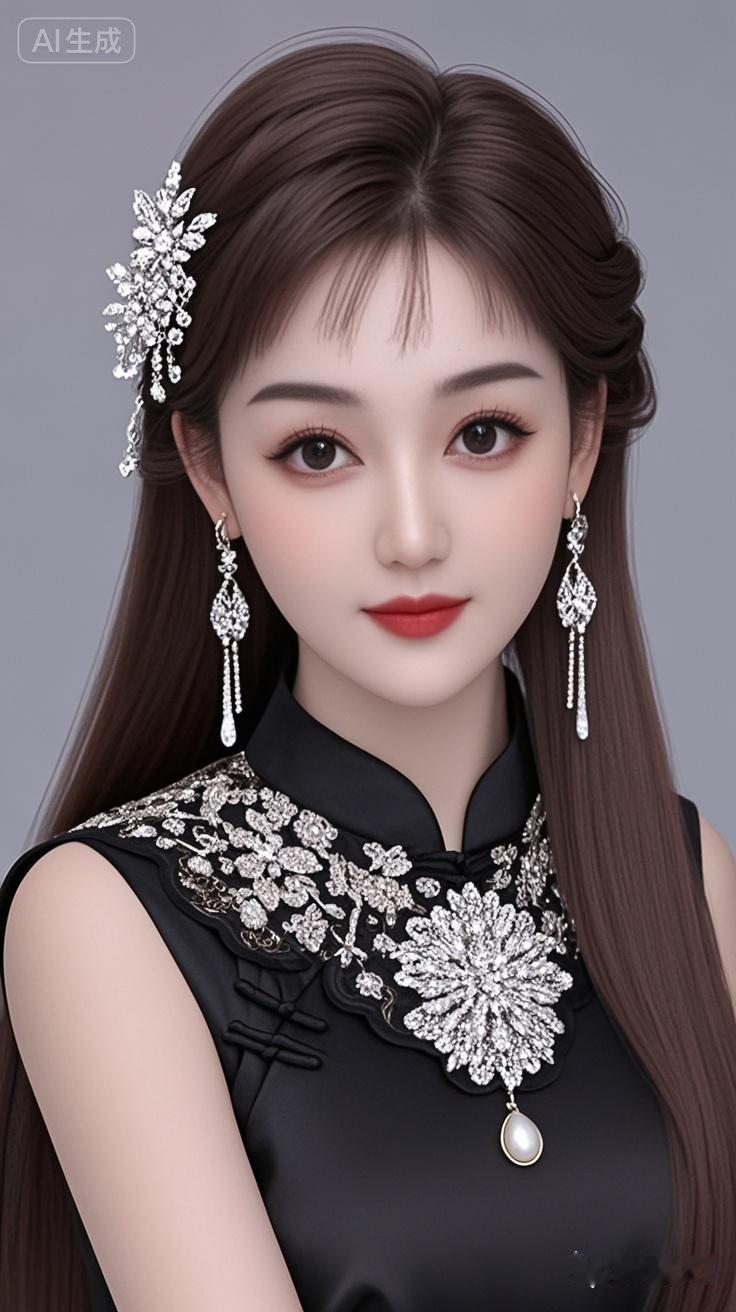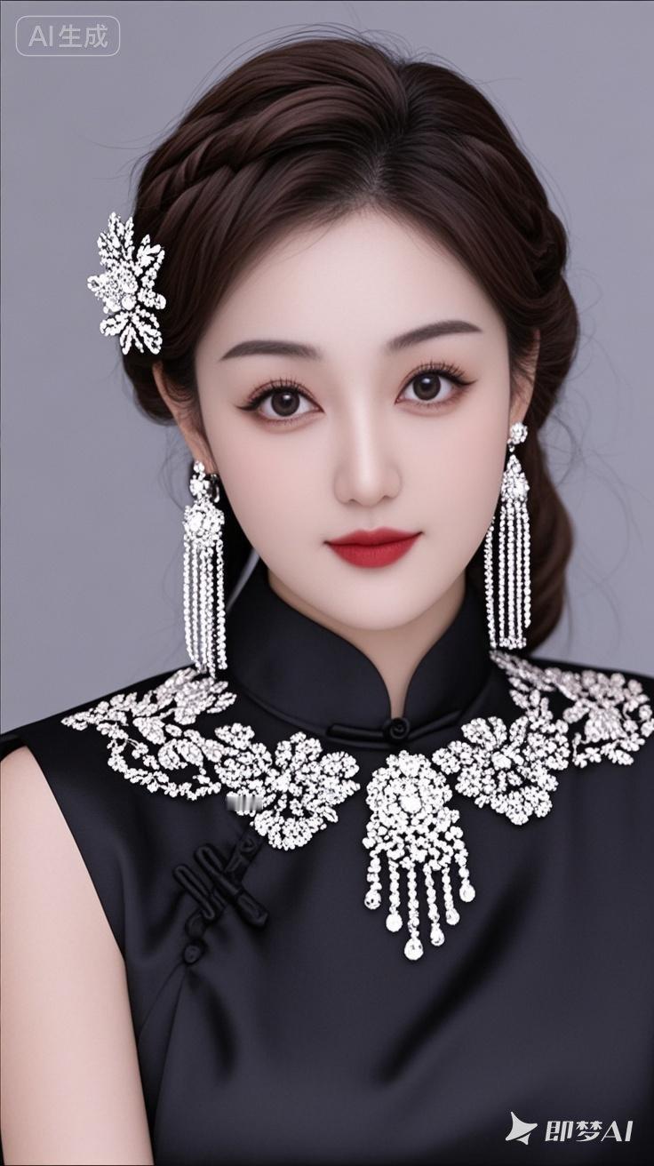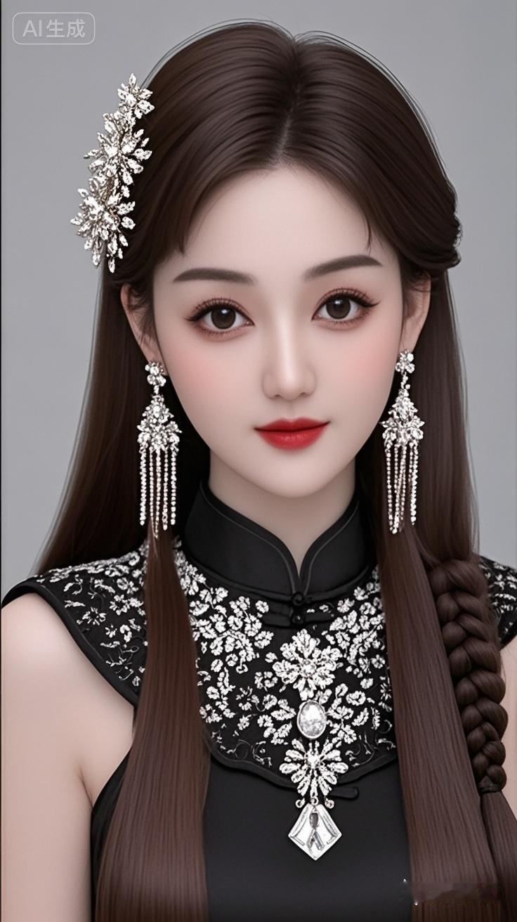 19岁古风现代美女,专业人像摄影,发丝柔顺有光泽,黑棕色长直发头顶一缕编发,发饰金属钻石花,浓眉大眼睛明亮有神,皮肤白皙,长卷睫毛,长耳坠金属钻石花,外面黑色丝稠刺绣花云肩,珍珠长流苏云肩少女人像写真